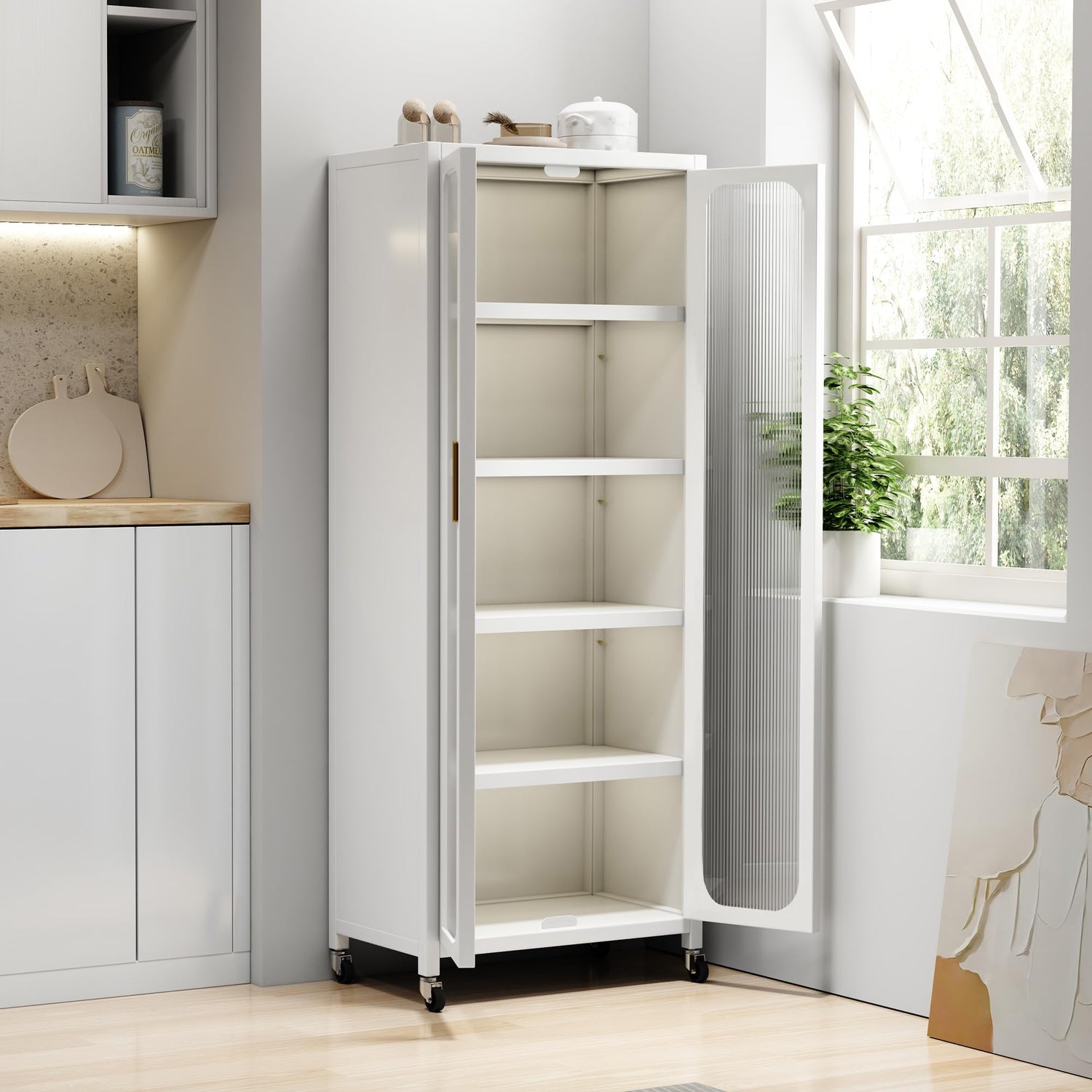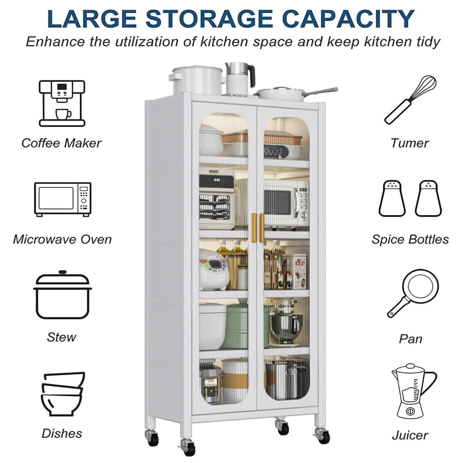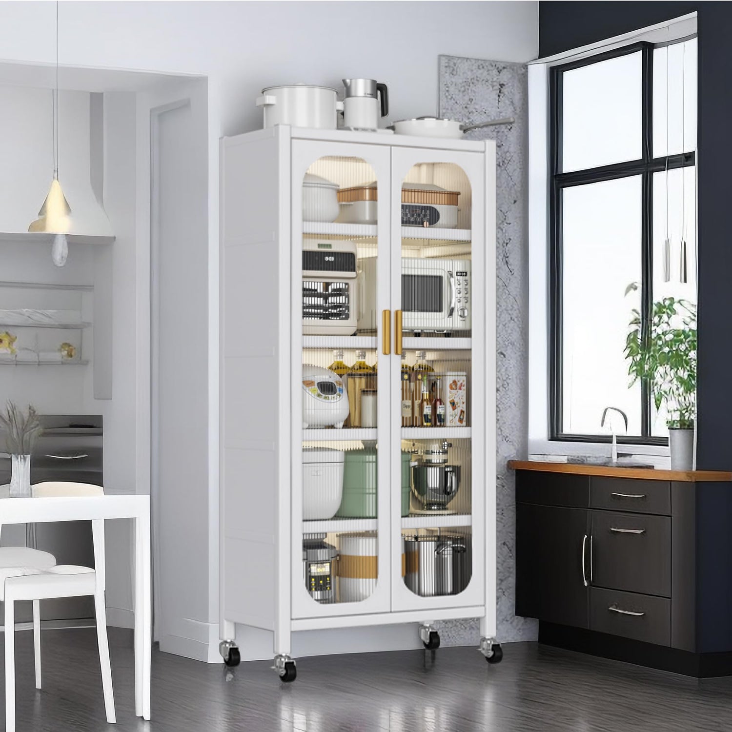 Runboll Kitchen Pantry Storage Cabinet, 6 Tier Metal Sideboard with Wheels and Acrylic Glass Door, Modern Display Curio Cabinet Bookcase White