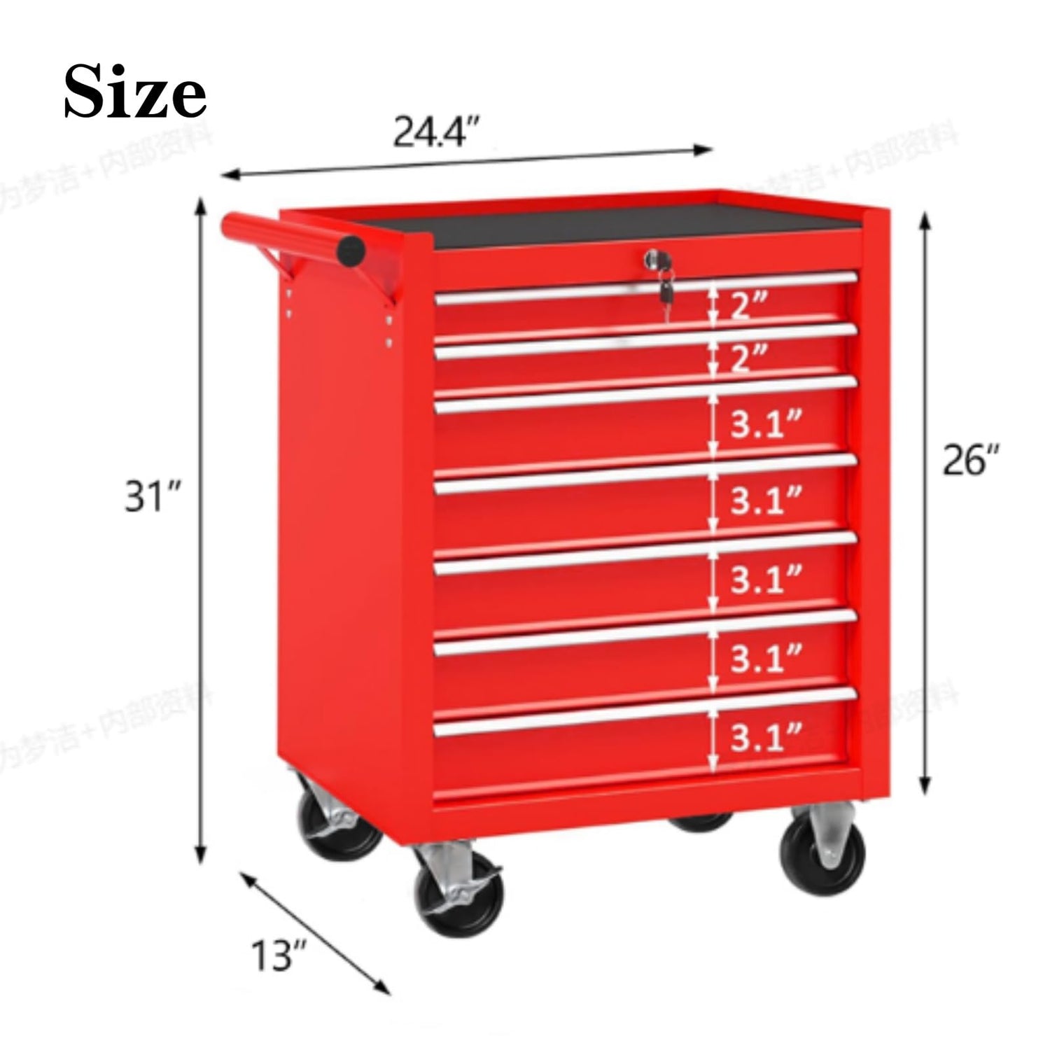 Details: SEVOBAL Tool Chest, 7-Drawer Rolling Tool Storage Cabinet with Interlock Mechanism & Spacious Bottom Area, 31'' Metal Utility Cart with 4 360°Universal Wheels & Central Lock for Garage Work Shop, Red