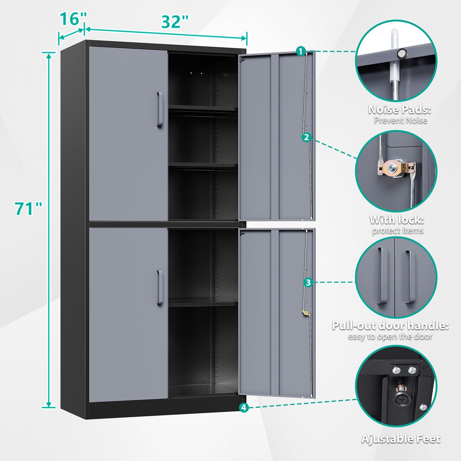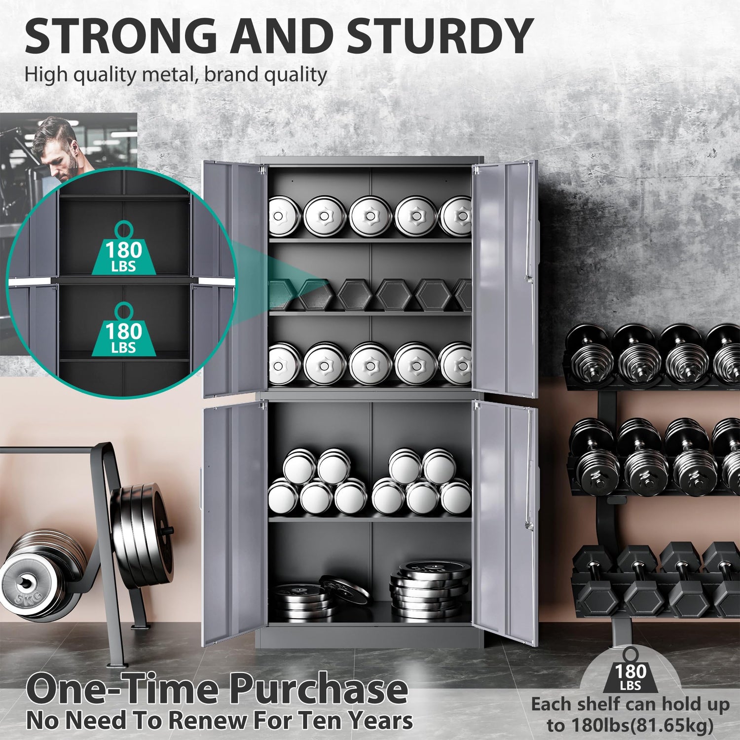 • 【Door with Magnets】 4 door locker design, high-grade lock, can secure valuables, and can also be mounted on the wall, so you can use the garage cabinets as home gym storage,garage storage cabinets, bathroom storage cabinet, office storage,kitchen storage cabinets,outdoor storage cabinet,cabinet, tool storage cabinet use