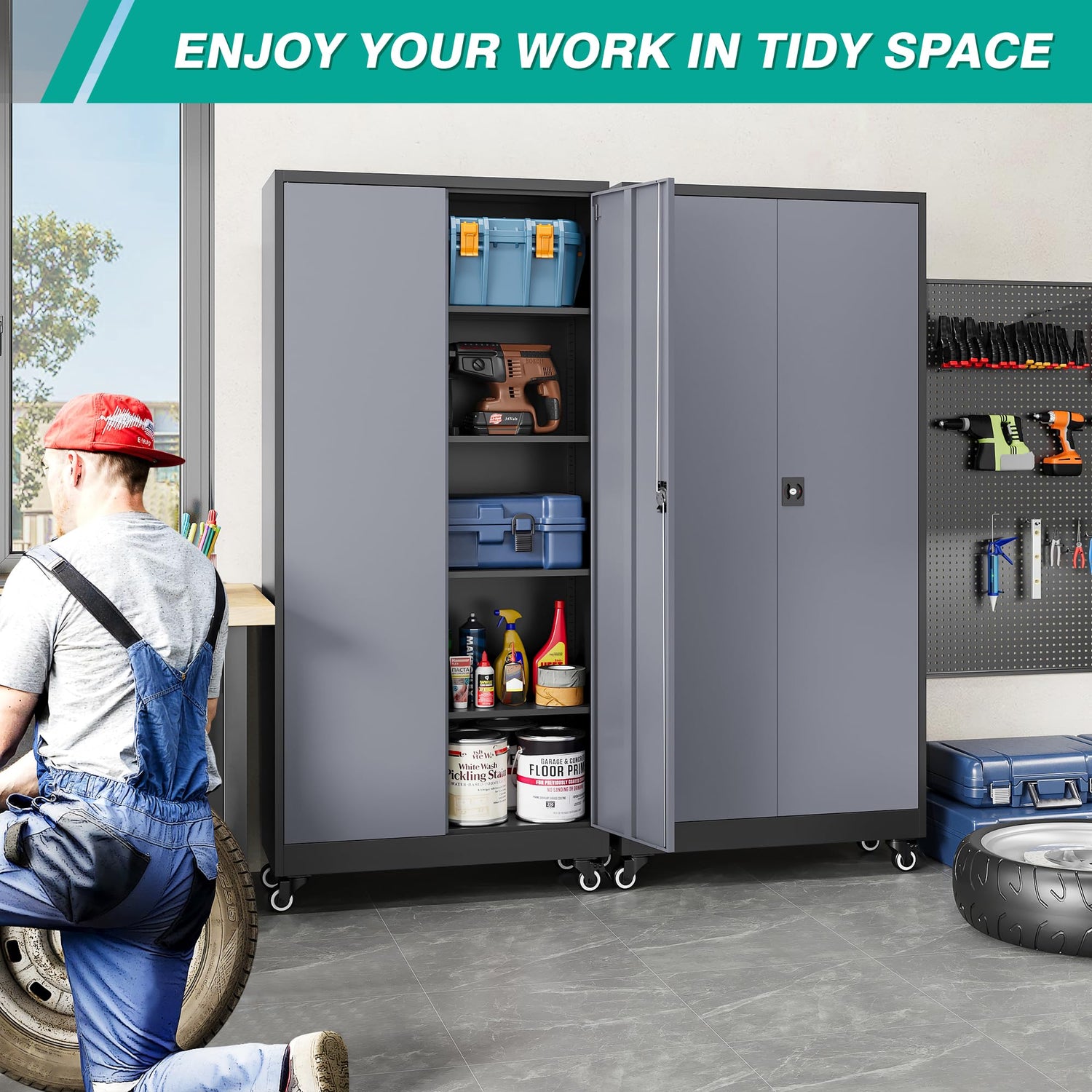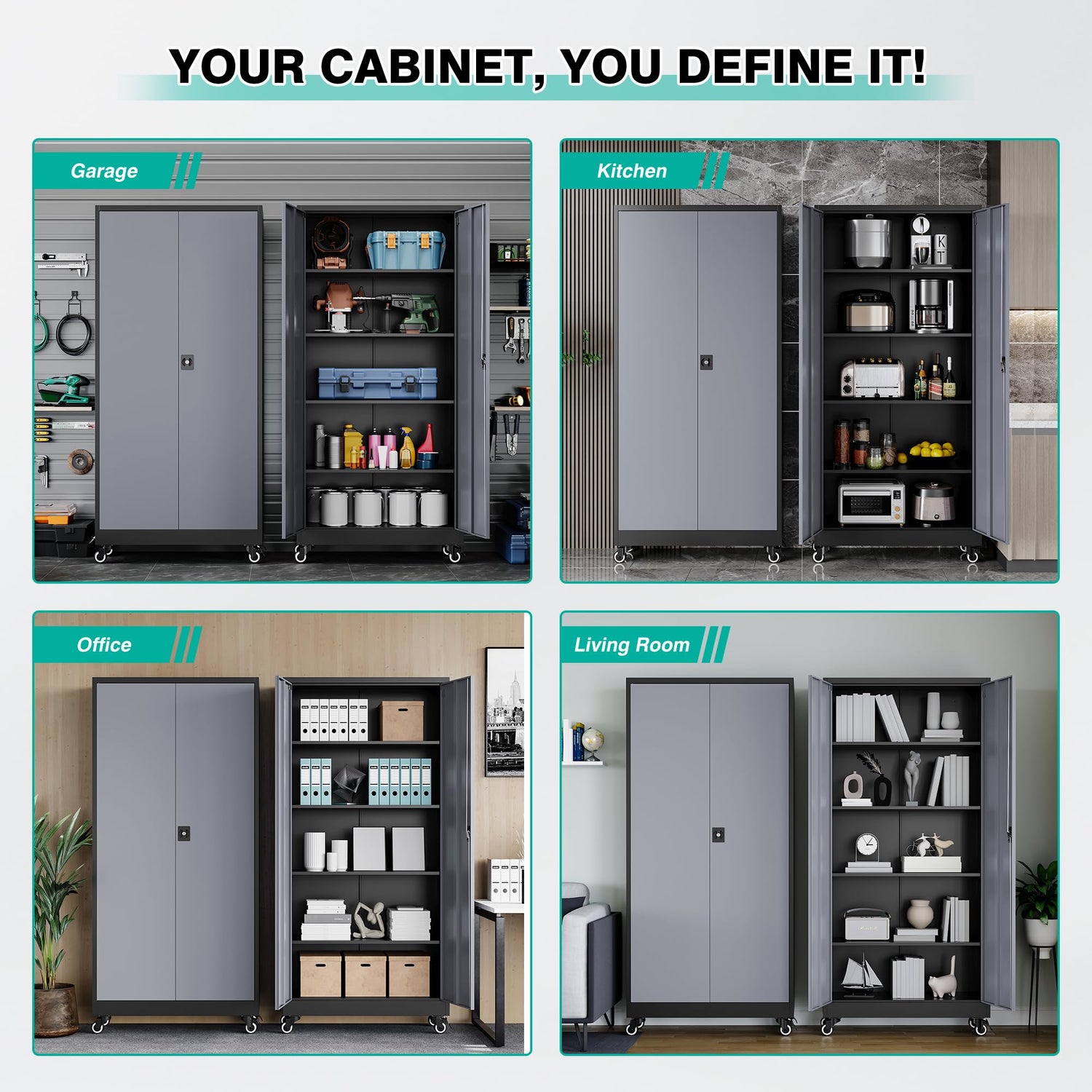 SISESOL Metal Storage Cabinet with Wheels,75 inch Rolling Garage Storage Cabinet with Lock,Gray Metal Cabinets with Wheels and Shelves,Tall Tool Cabinets on Wheel for Garage,Home,Office,Shop