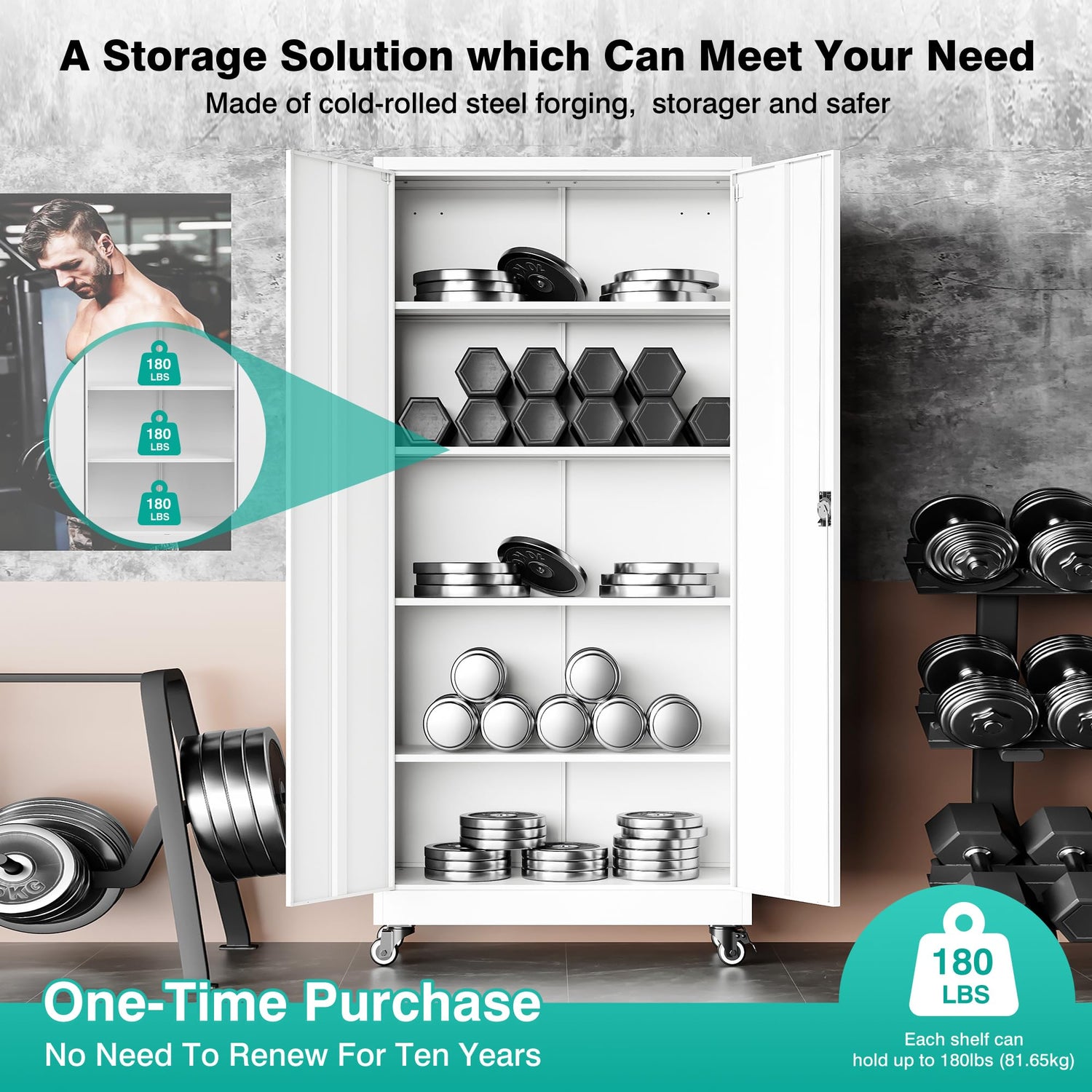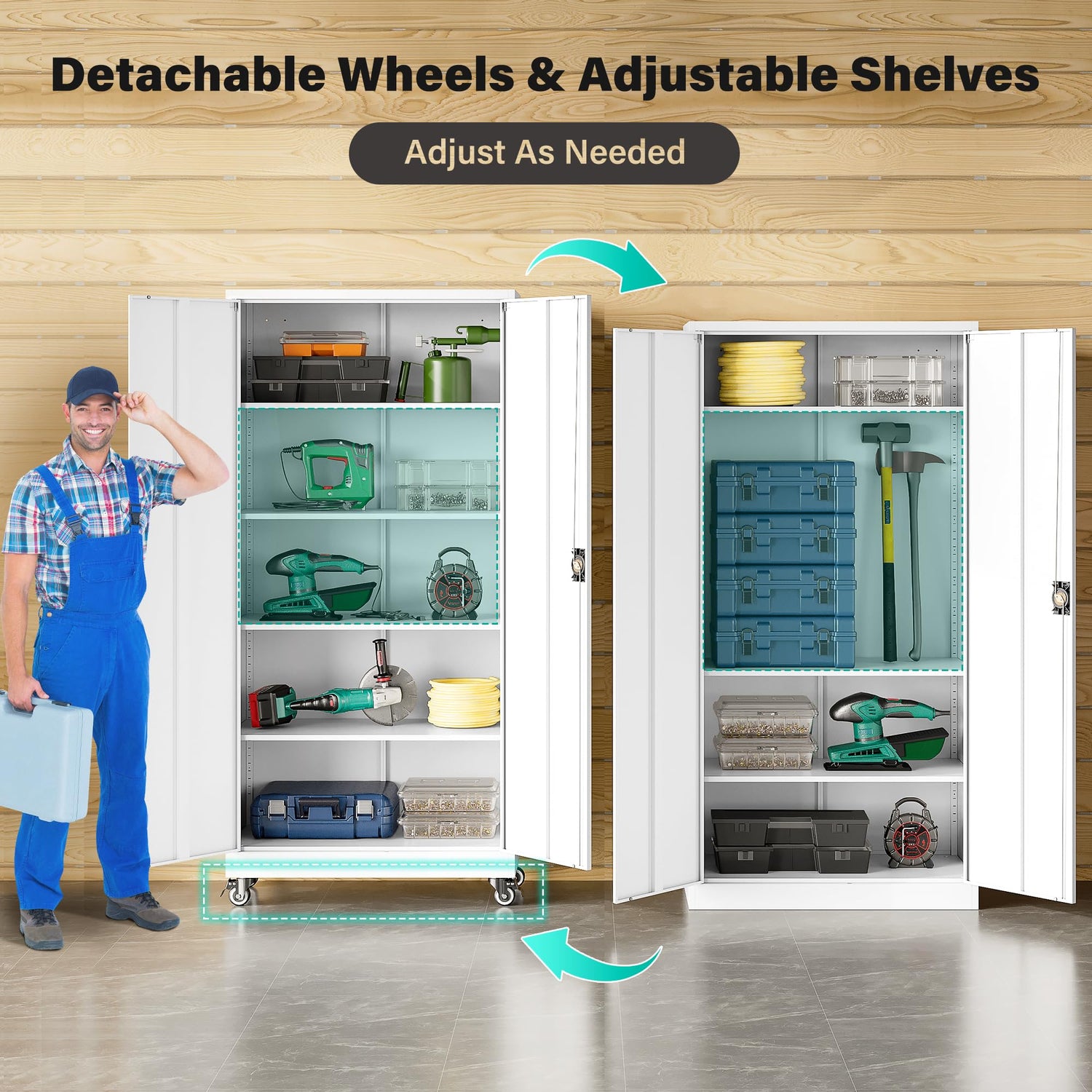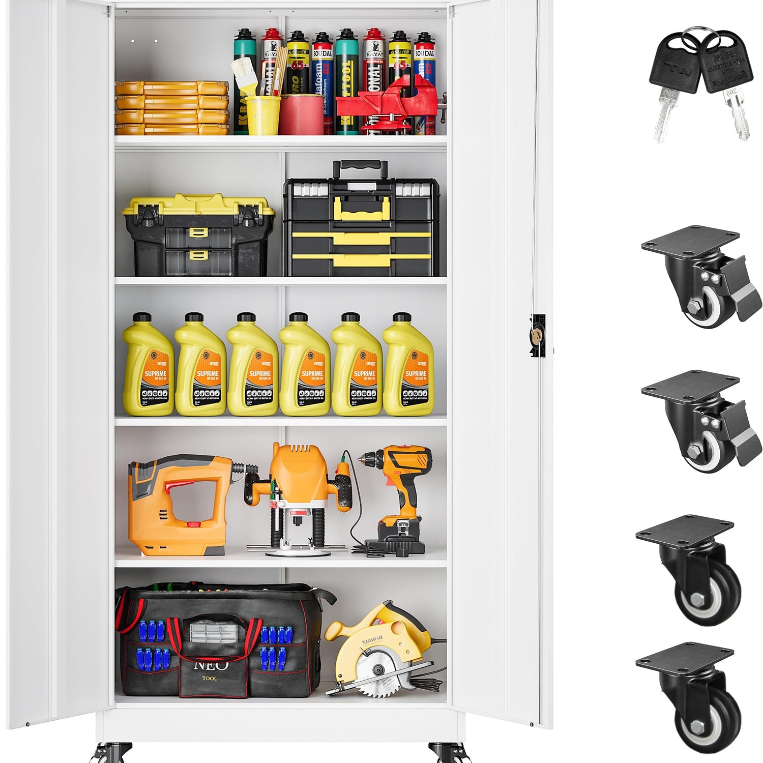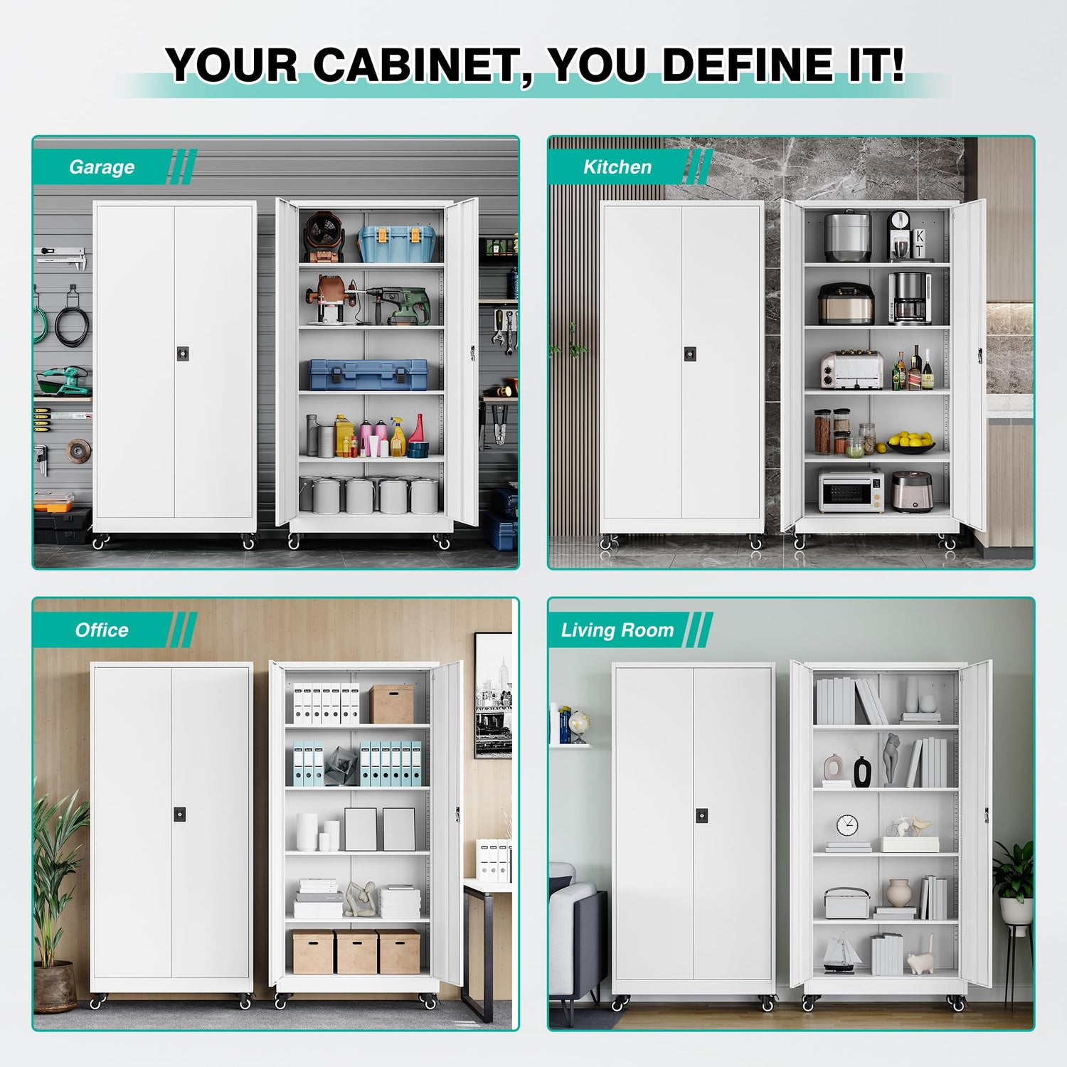 SISESOL Metal Storage Cabinet with Wheels,75 inch Rolling Garage Storage Cabinet with Lock,White Metal Cabinets with Wheels and Shelves,Tool Cabinets on Roller for Garage,Home,Office,Shop