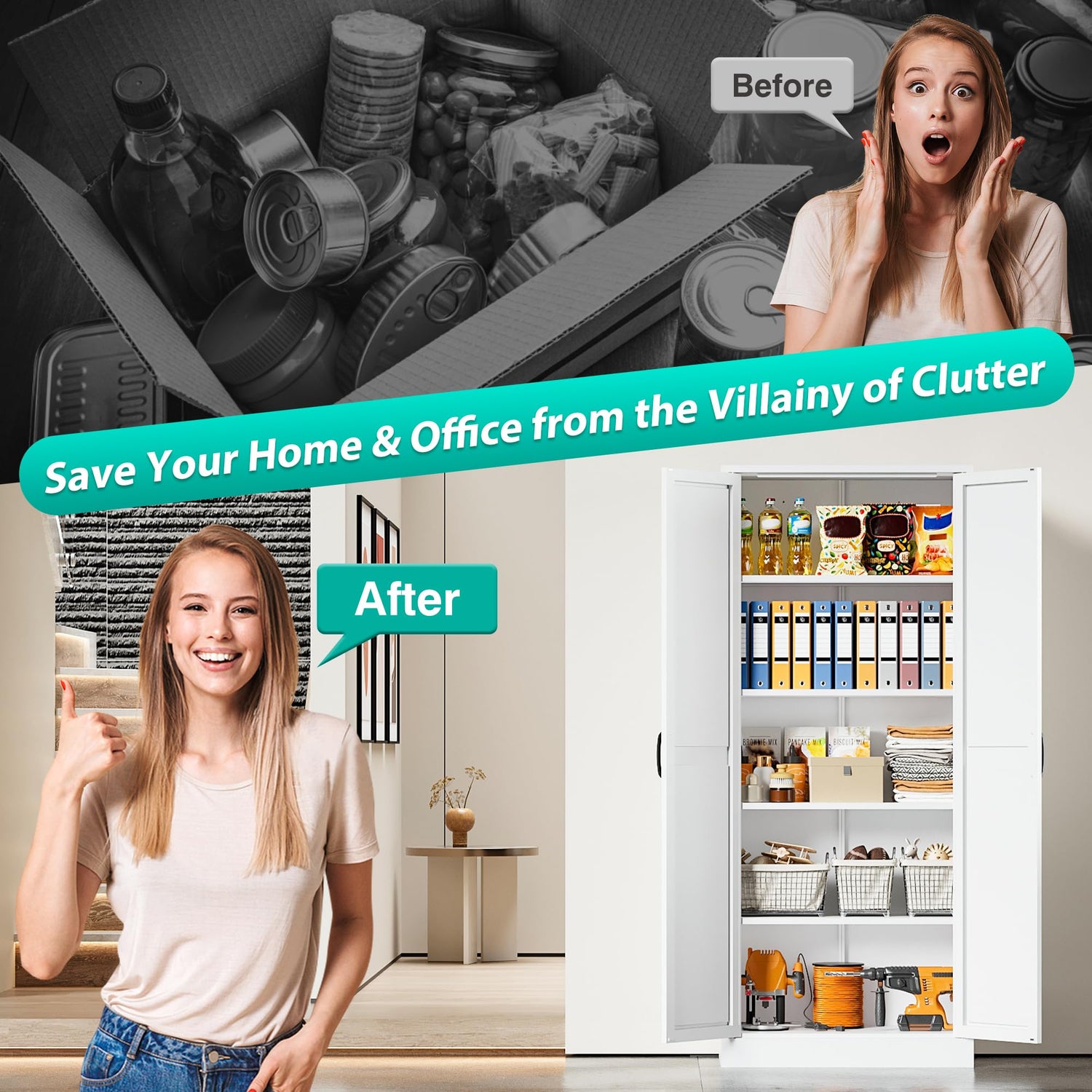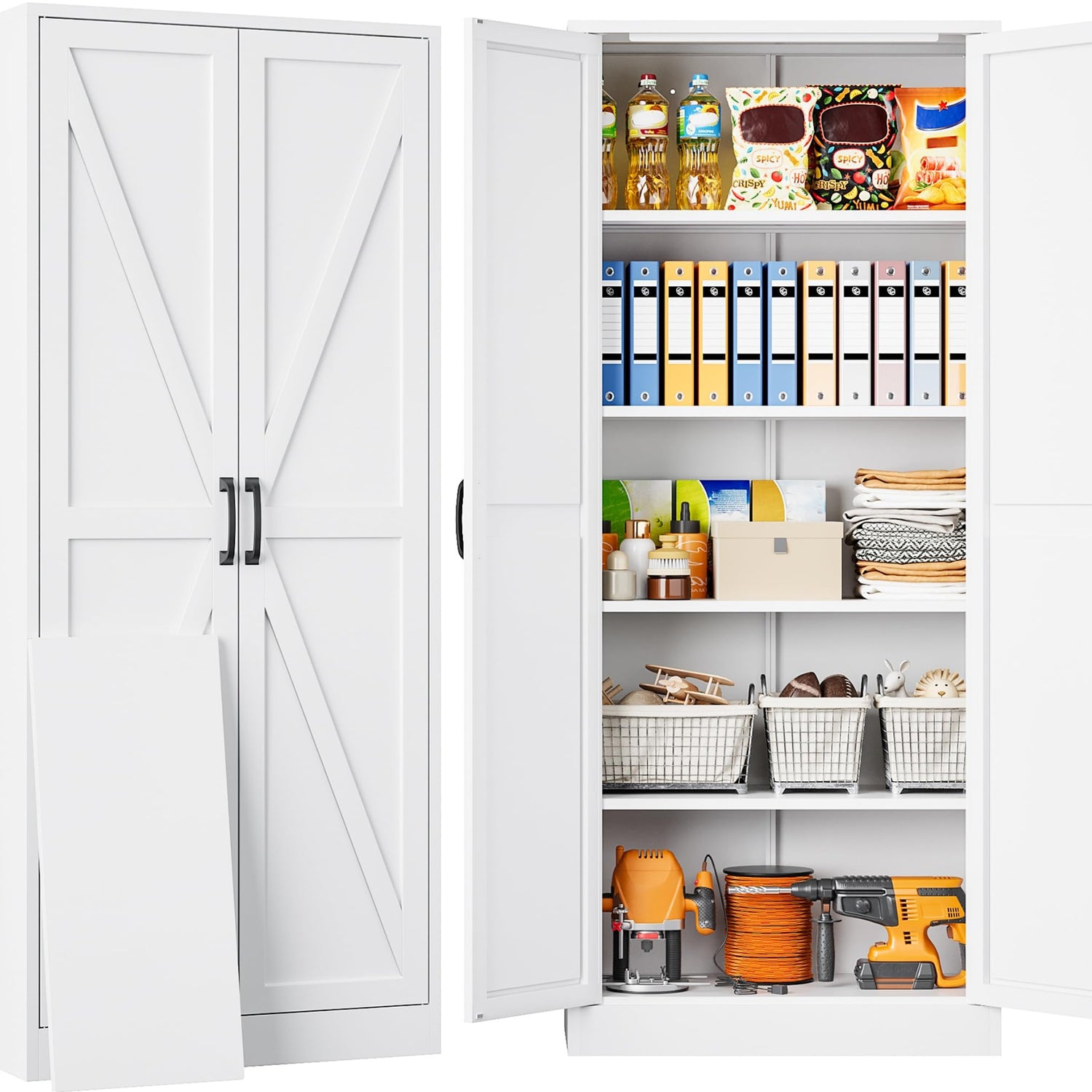 - 4 Adjustable Shelves: With large storage space and 4 height-adjustable shelves,white pantry cabinet storage can store both short and tall items,like cleaning supplies,food,dinnerware,kitchen appliances,small items like toys,spices and olive oil etc.;