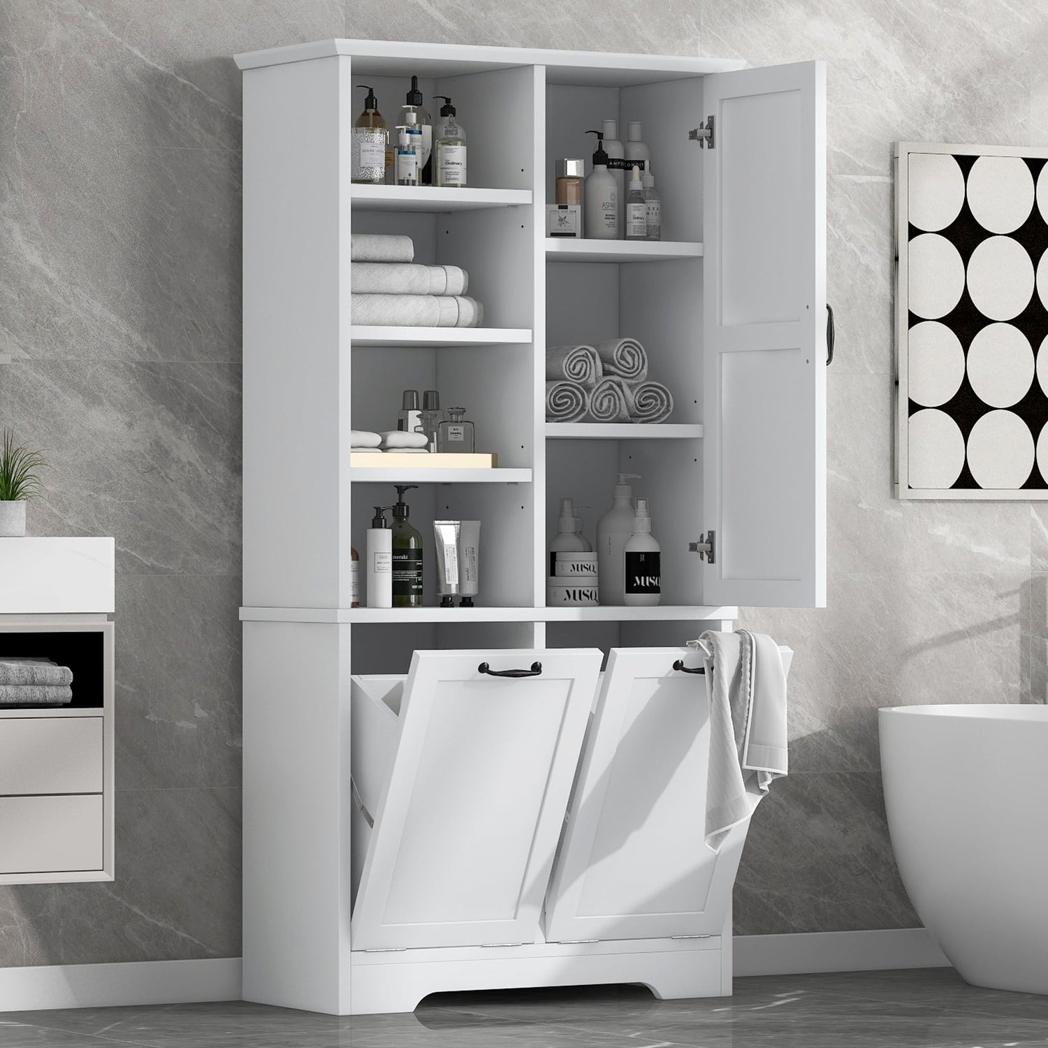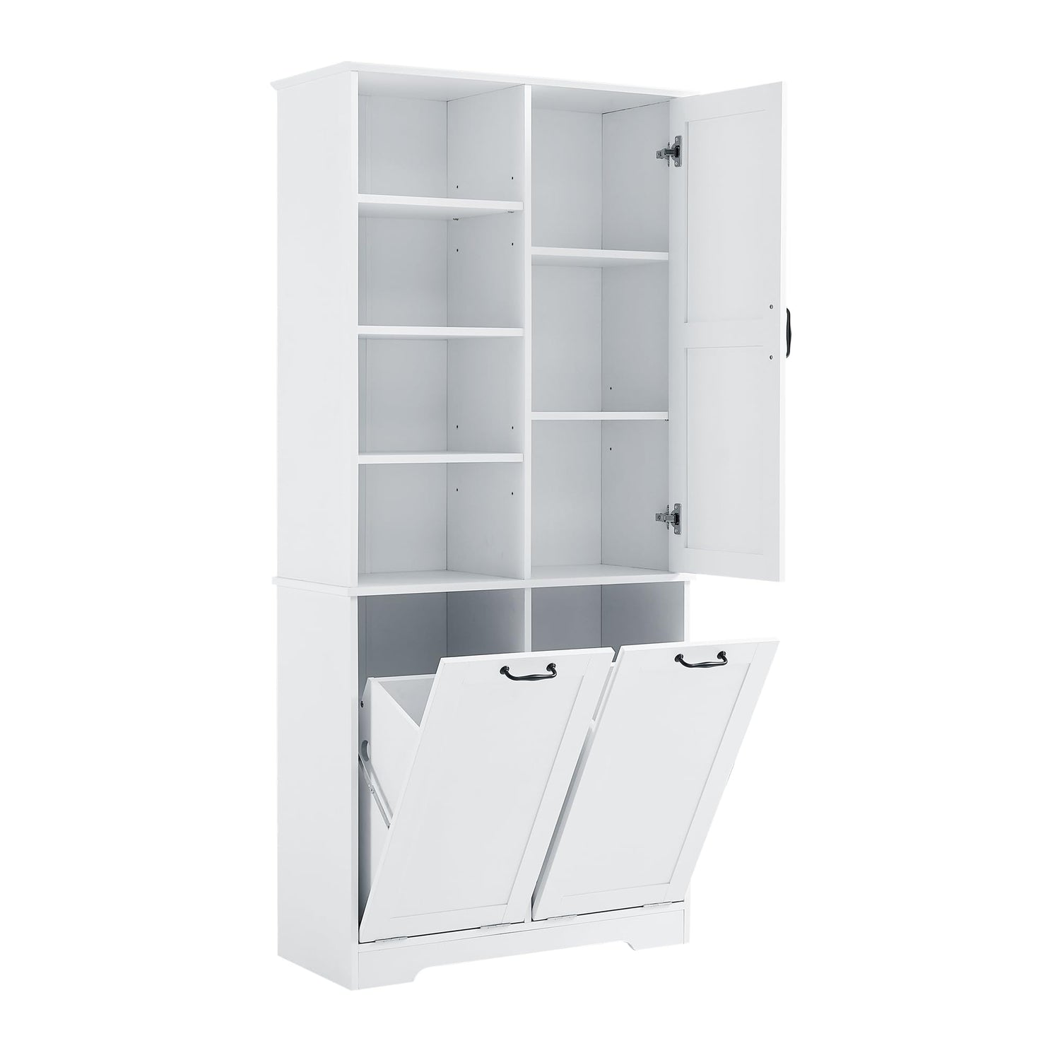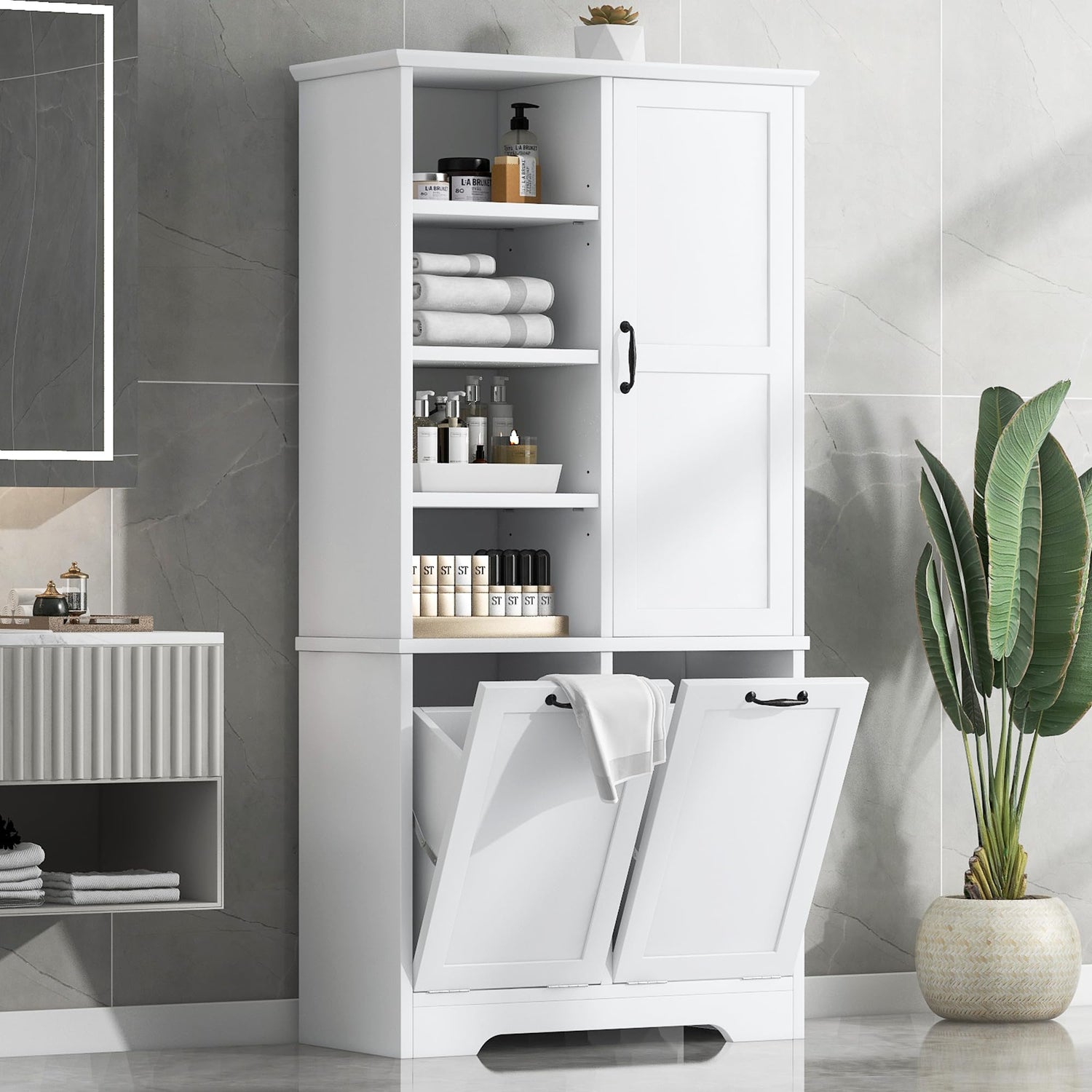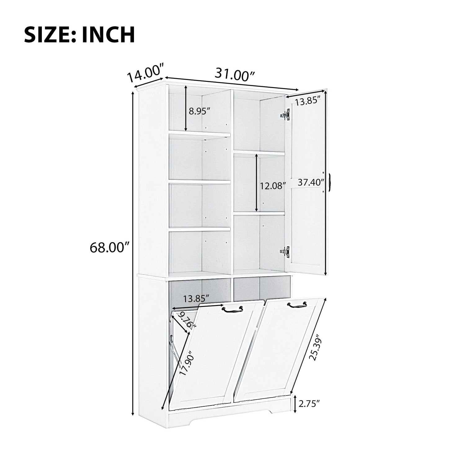 SOFTSEA 68" Double Tilt Out Laundry Hamper, Tall Bathroom Storage Cabinet with Hidden Laundry Basket & Adjustable Shelf, Freestanding Bathroom Cabinet with Doors and Open Shelves, White