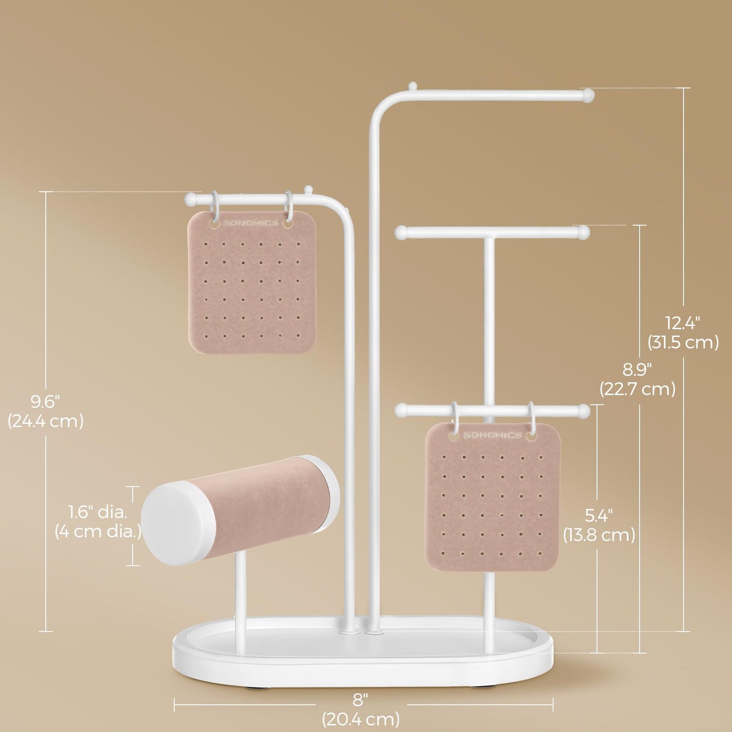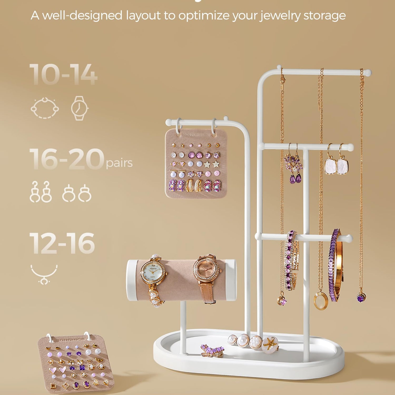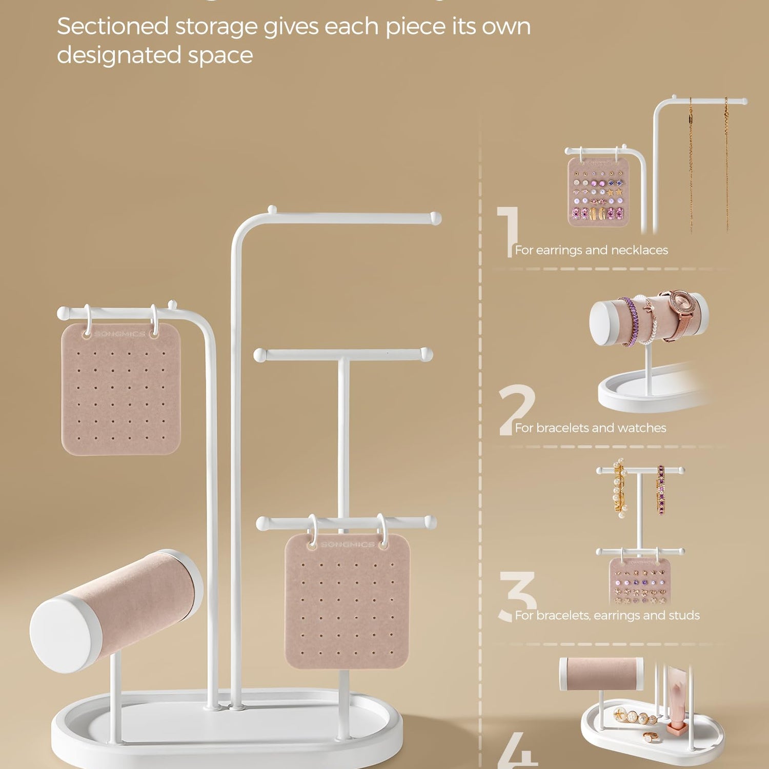 - [No More Tangled Jewelry] Make your everyday accessorizing easy with this jewelry stand. It has 1 lower rod for bracelets and watches, 2 bars for necklaces, 2 earring boards and a base tray to keep your jewelry tangle-free and easily accessible
