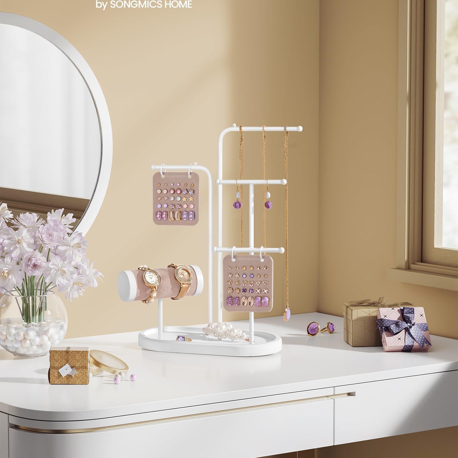SONGMICS Jewelry Stand, Jewelry Organizer, Jewelry Display Holder with Metal Frame, 2 Earring Boards, 4 Hanging Rods, Necklace Earring Bracelet Holder, for Watches, Cloud White UJJS025W01