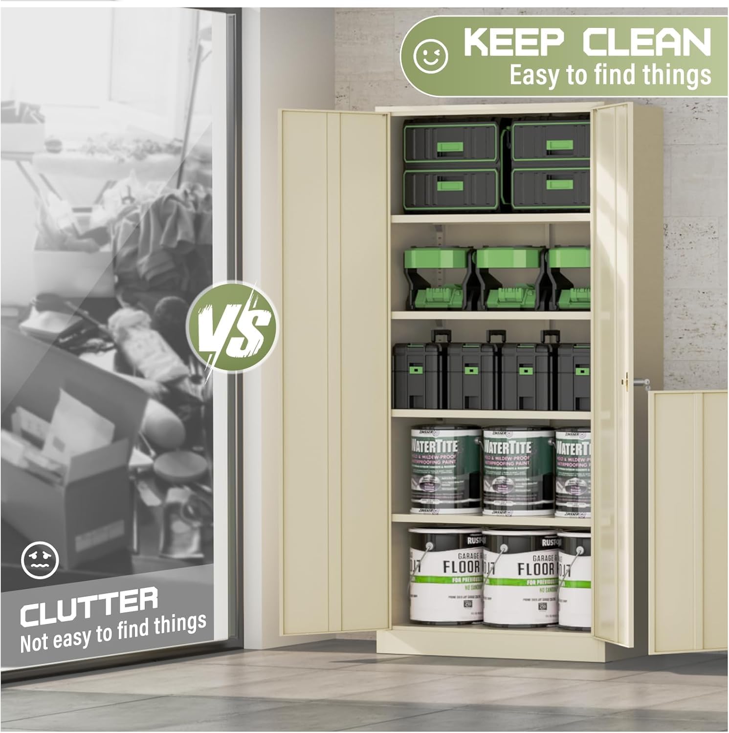 - 【High quality metal materials】Our metal storage cabinet is meticulously crafted with high-quality 0.8mm steel plates. We reinforce each cabinet shelf with additional steel bars to prevent the partitions from deforming and getting dents. It's scratch-resistant, easy to clean and can prolong the service life of the garage cabinet during frequent use.