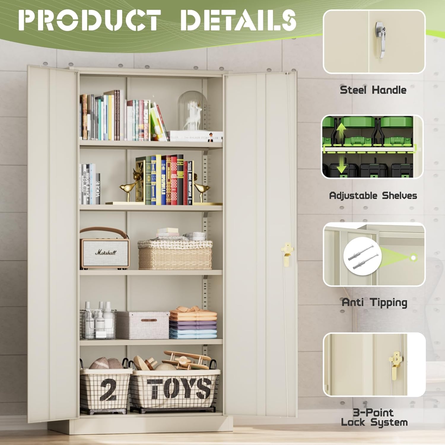 - 【Upgrade design】The metal storage cabinet features 4 adjustable shelves to accommodate items of various sizes. Each shelf can bear a weight of 180 pounds. There are reserved holes at the back of the cabinet for wall installation, and it has an anti-tipping design.
