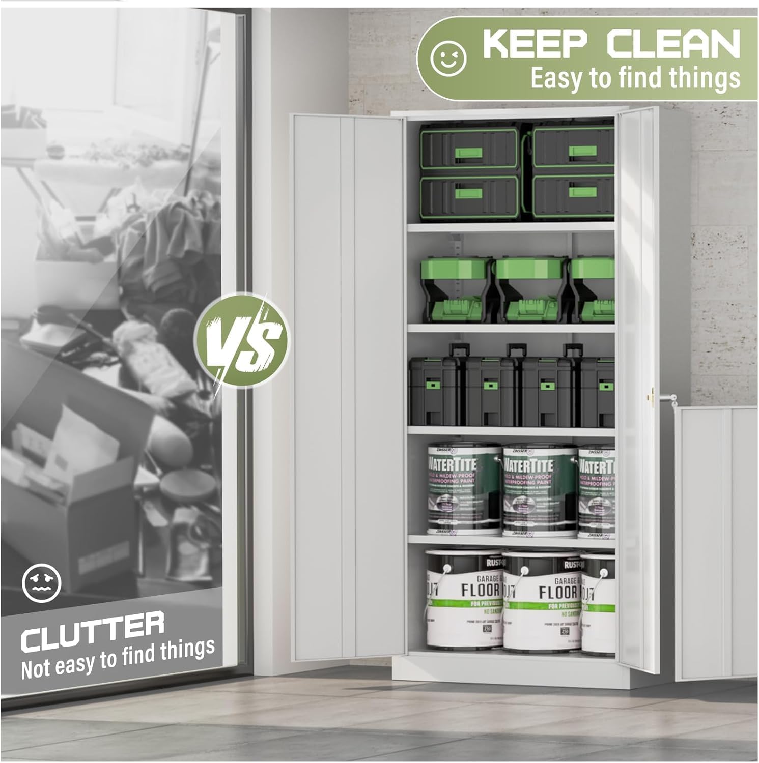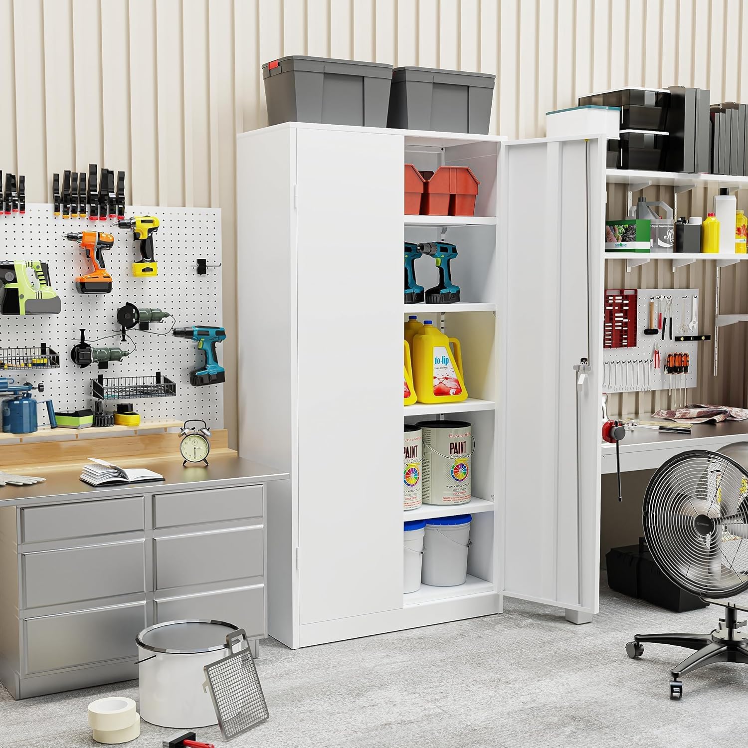 SUNCROWN Metal Storage Cabinets with Lock, Tool Cabinet, 72" Locking Steel Storage, Tall Locker Organizer Garage Cabinets with 2 Doors and 4 Shelves for Home,Office,Warehouse,Garage,School(White)