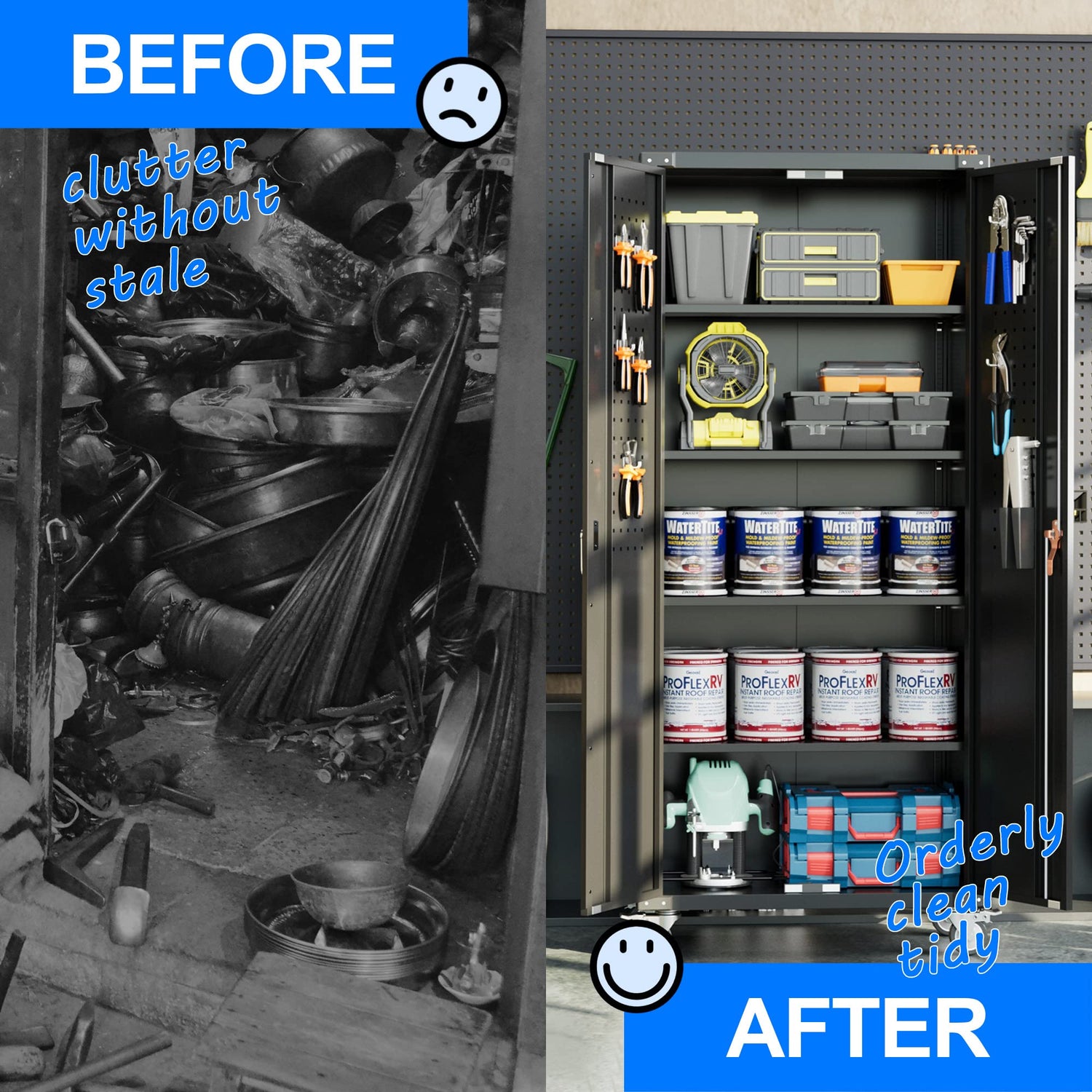 - New Upgrade:Metal Cabinet has lots of room to organize your belongings.In order to meet customer storage requirements, the newly upgraded metal cabinet with Pegboard(Including 4 hooks) for storing tools and other items, fully utilizing space