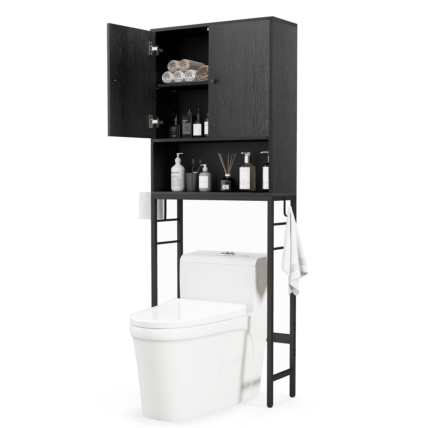 Tangkula Over The Toilet Storage Cabinet, Bathroom Space Saver with 2 Doors, Adjustable Shelf, 2 Side Hooks, Metal Stand, Freestanding Above Toilet Storage Cabinet for Restroom, Laundry (Black)