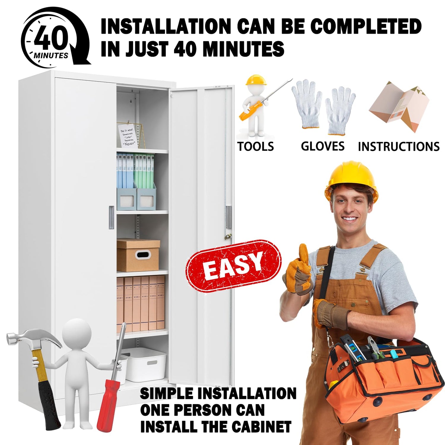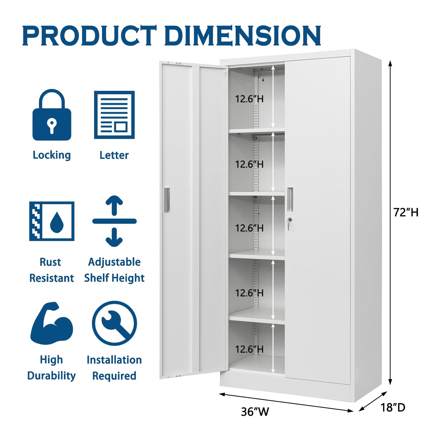 • 【EASY TO ASSEMBLE】: 72"H x 32"W x 18"D. Two locking doors with a 120°opening angle. The package of this Metal storage cabinet comes with detailed assembly instructions and our customer service team will also help you. Follow the step-by-step instruction manual and you will be done in 45 minutes.