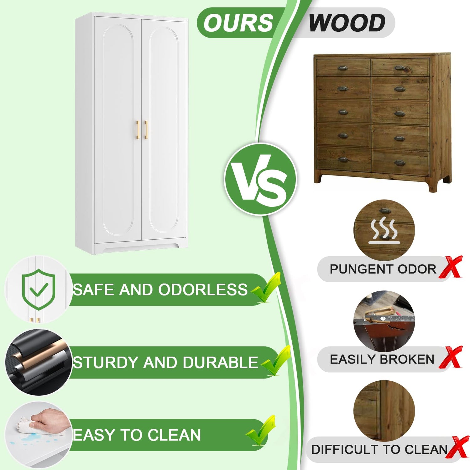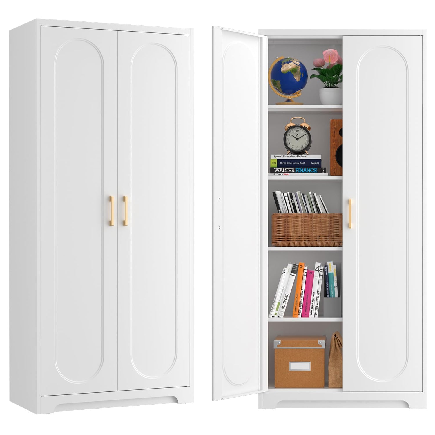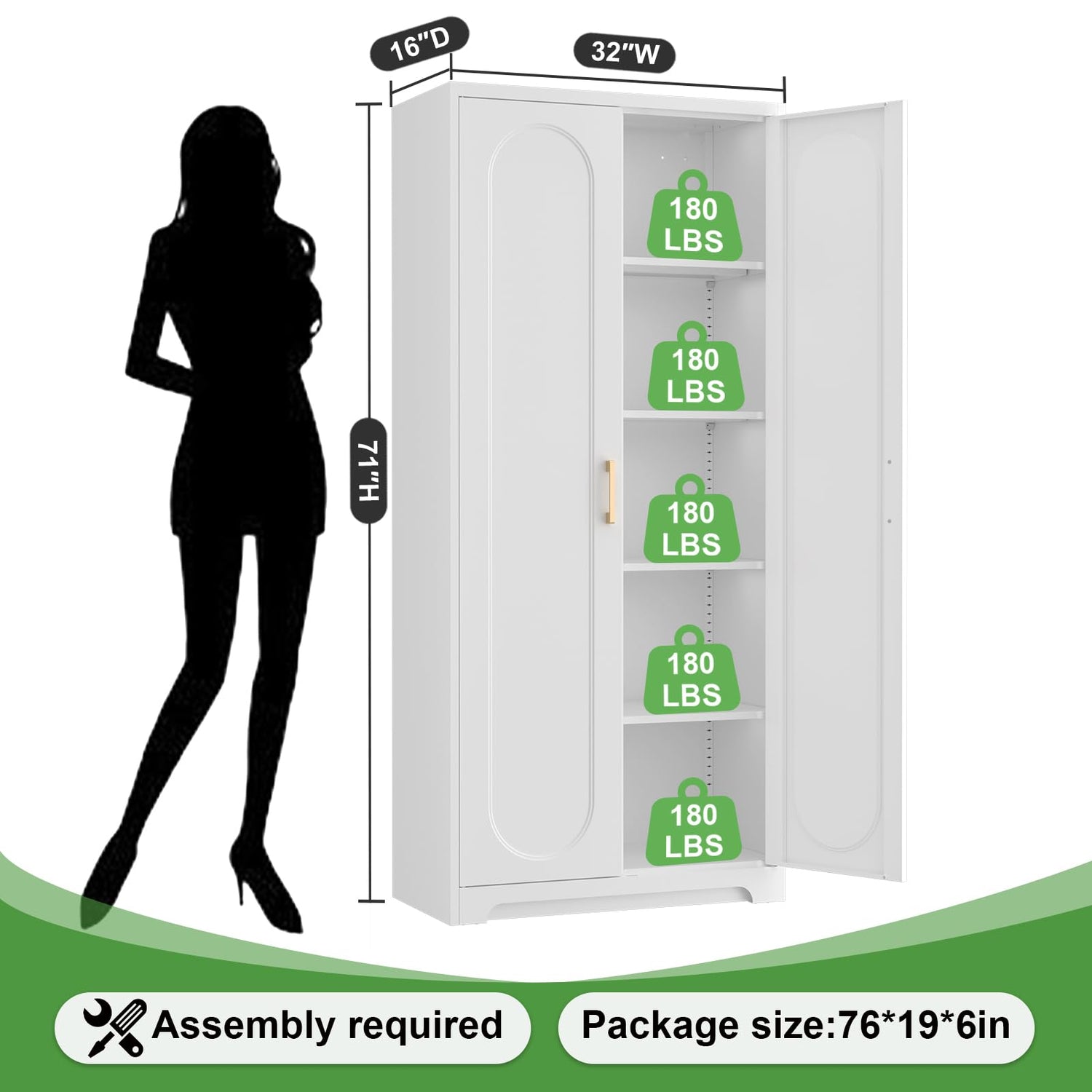 - HIGH QUALITY METAL:This pantry cabinet is made of heavy-duty cold rolled steel, easily holds 180lbs in a single layer. The surface of tall storage cabinet is made of excellent quality powder coating, phosphated, wear and scratch resistant. Compared to wooden cabinets this storage cabinet has no odour easier to clean. Long-lasting use, safe and healthy.