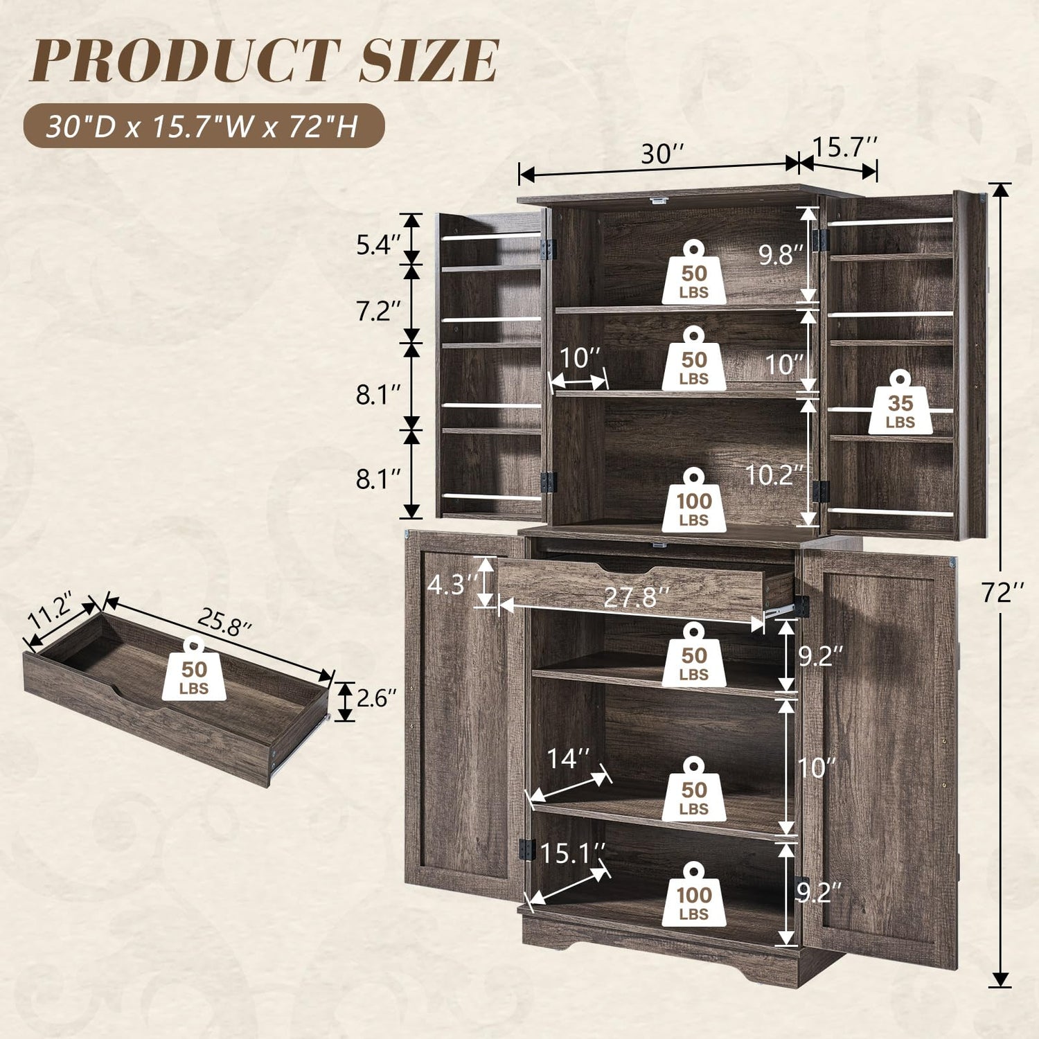 • Ample Storage Space: Features 6 shelves (2 adjustable), 8 door organizers, and a hidden drawer. Measuring 30"W x 15.5"D x 72"H, it provides plenty of room for food, tableware, or appliances while keeping your home tidy.