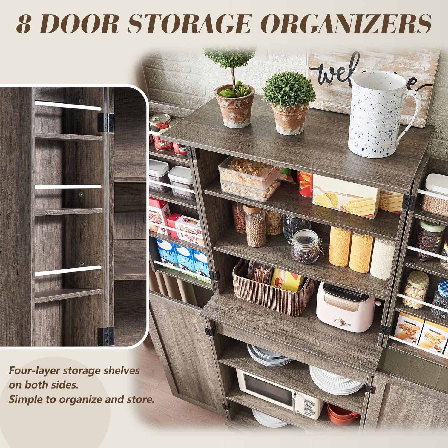 VanAcc 72" Tall Farmhouse Kitchen Pantry Cabinet with Door Organizer & Adjustable Shelves, Wooden Storage Cupboard with Drawer and Barn Doors for Kitchen, Dining Room, Living Room, Grey Oak
