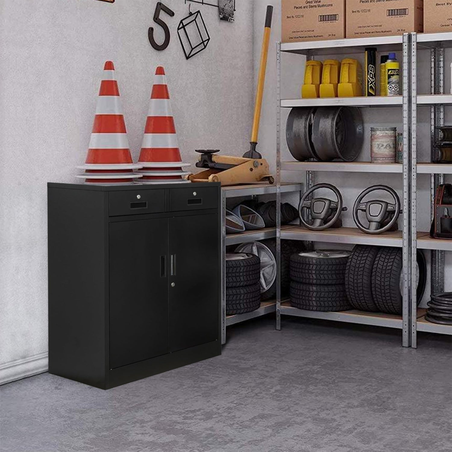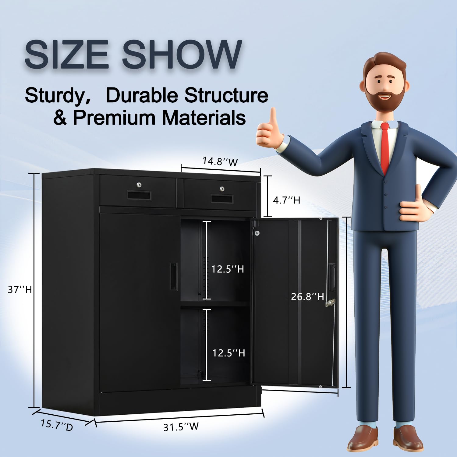 YEEZER Metal Storage Cabinet with 2 Drawers. Lockable Steel Storage Cabinet with Doors and Shelve, 37”H Office Cabinet for Home, Garage, Warehouse with Large Storage Space. (Black)
