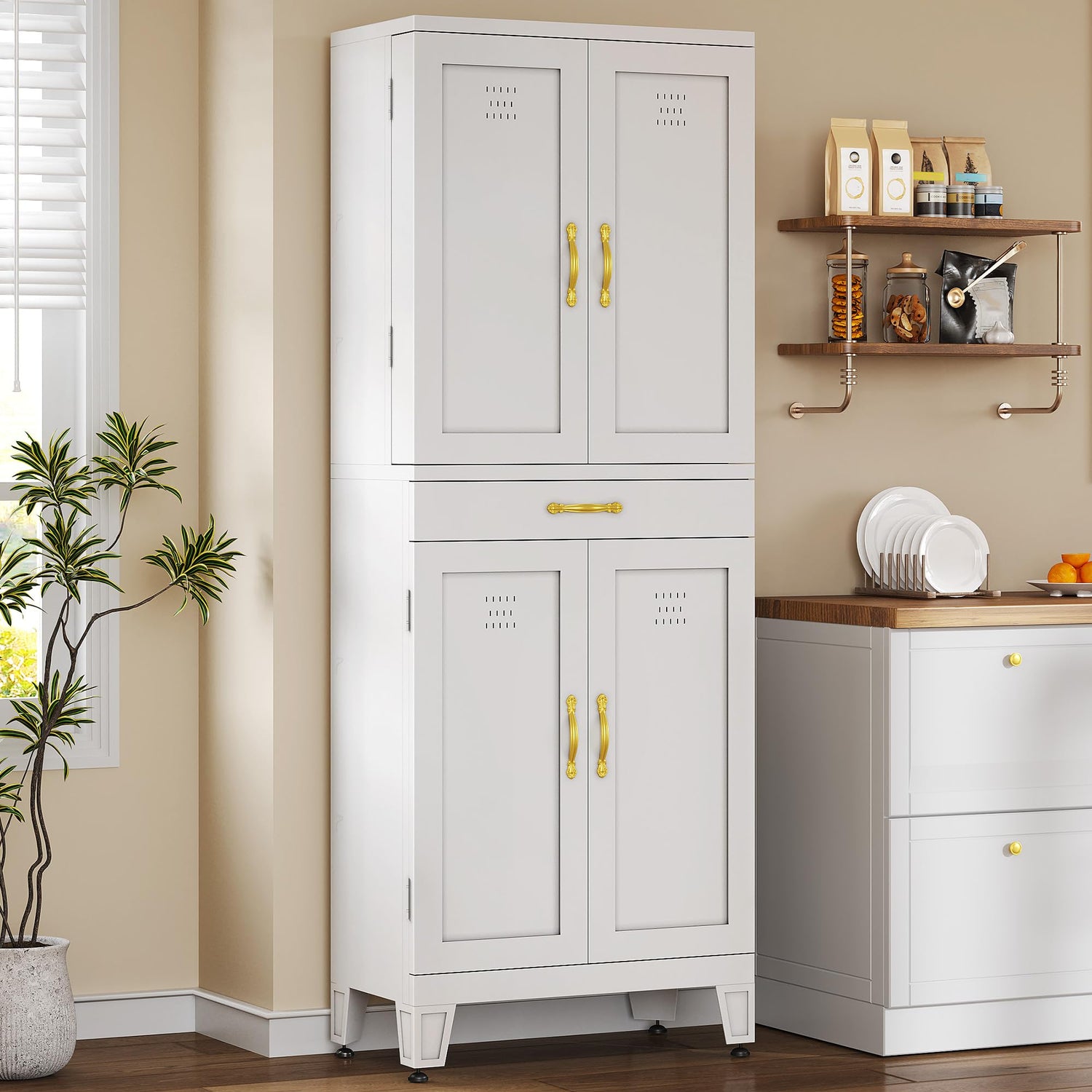 YITAHOME 71" Tall Kitchen Pantry, Metal Kitchen Storage Cabinet with Adjustable Shelves, Pantry Organizer with 2 Door and Drawer for Dining Room, Living Room, Bathroom, White