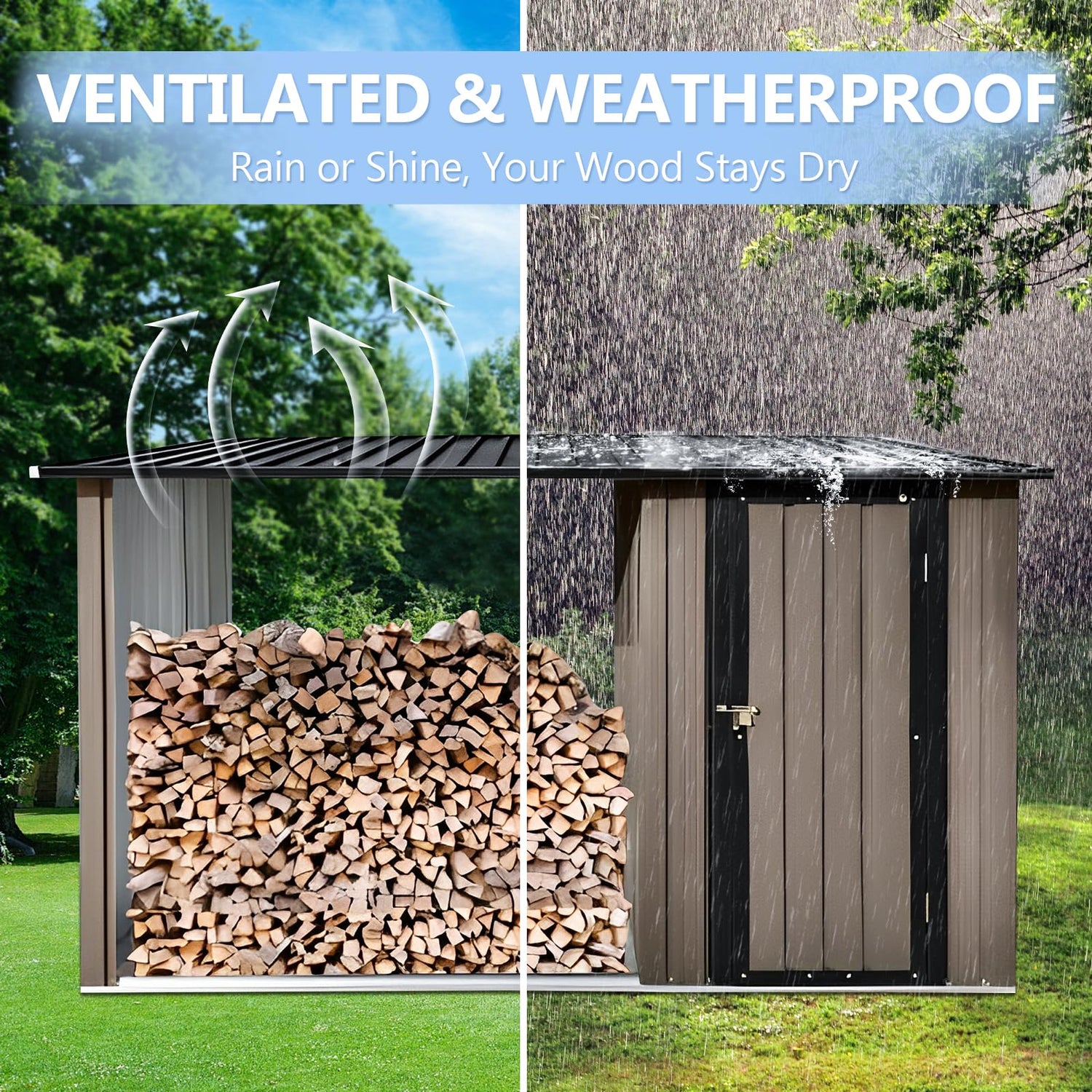 • 【Galvanized Steel + Impact Bars】Made with rust-resistant galvanized steel, our firewood shed withstands UV rays and weather; Reinforced metal ribs and impact bars ensure greater durability; Sealed gaps prevent rain from seeping in, it’s designed to protect your tools and firewood for years, rain or shine; The firewood storage shed is ideal for keeping your firewood dry and organized, ensuring easy access when you need it