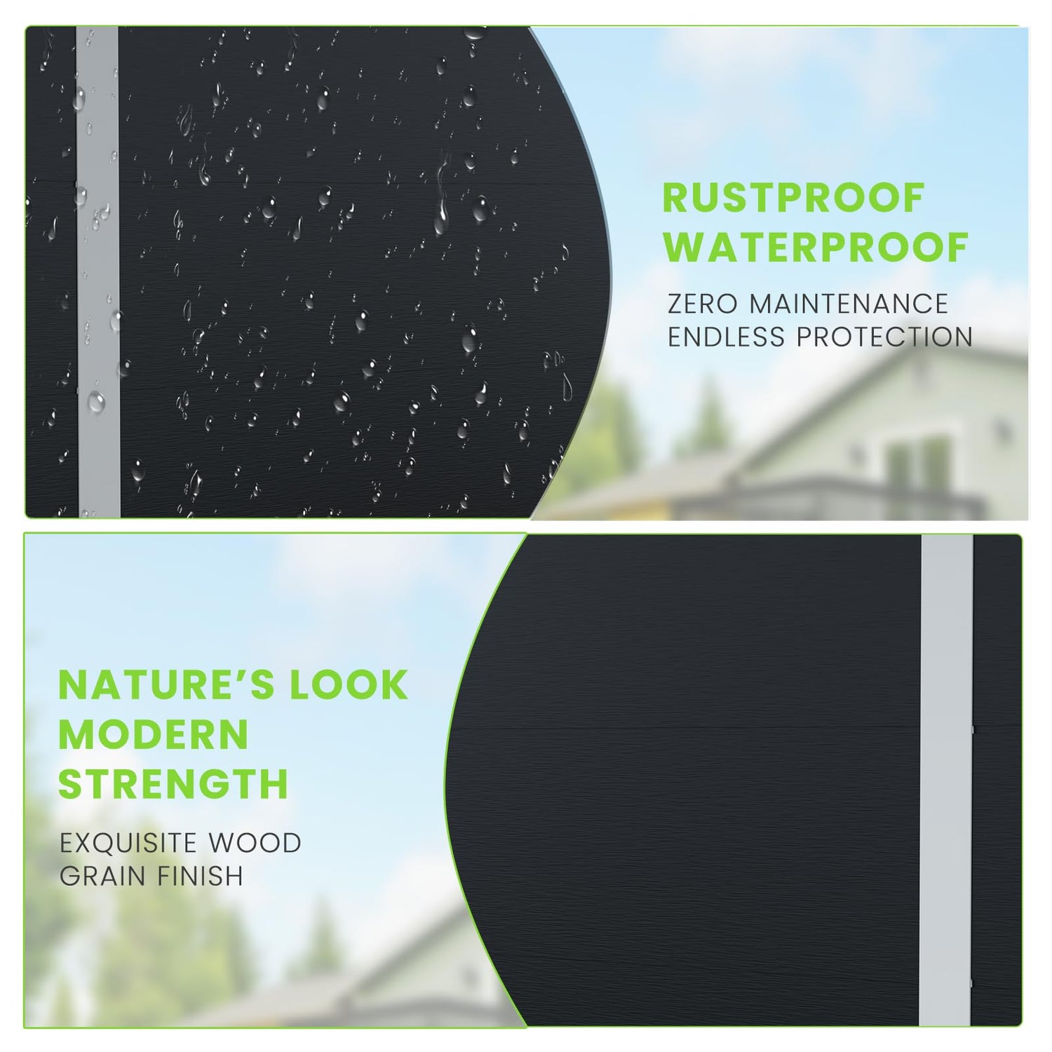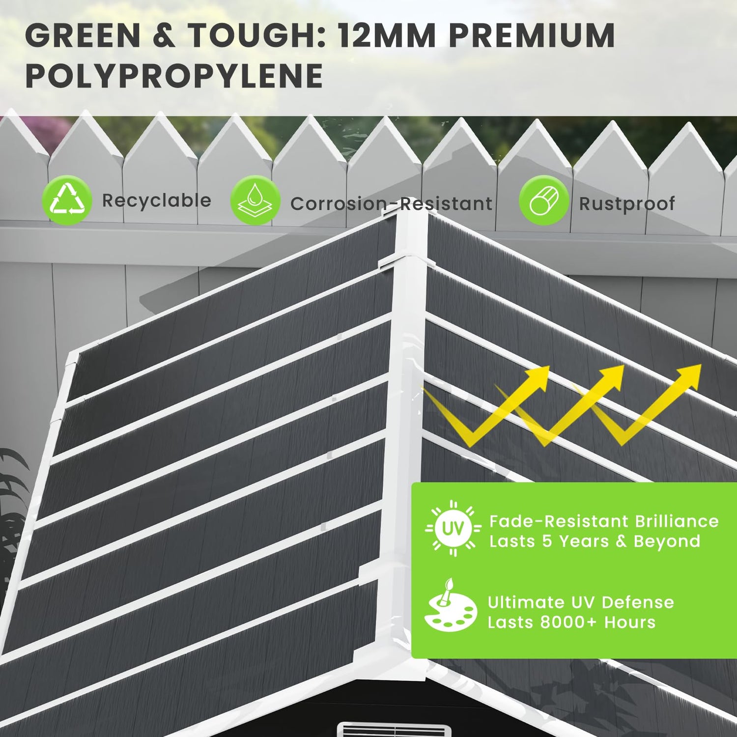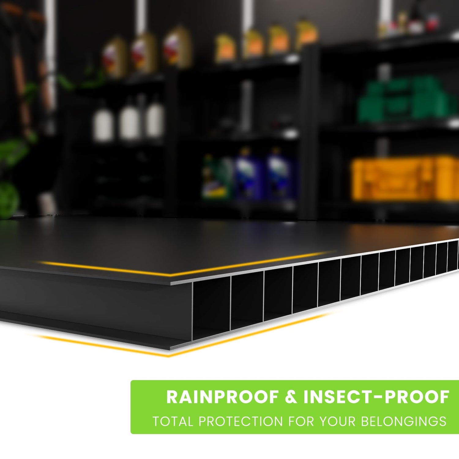 - Resin Plastic Shed MATERIAL: Our premium plastic shed is built with 12MM thick polypropylene resin material - an eco-friendly, recyclable solution for outdoor storage. This corrosion-resistant resin shed features waterproof and rustproof protection with built-in UV inhibitors to prevent fading for over 8000 hours (5+ years of sun exposure). The heavy-duty plastic walls resist bending and puncturing, making this weatherproof plastic shed ideal for year-round use in any climate.
