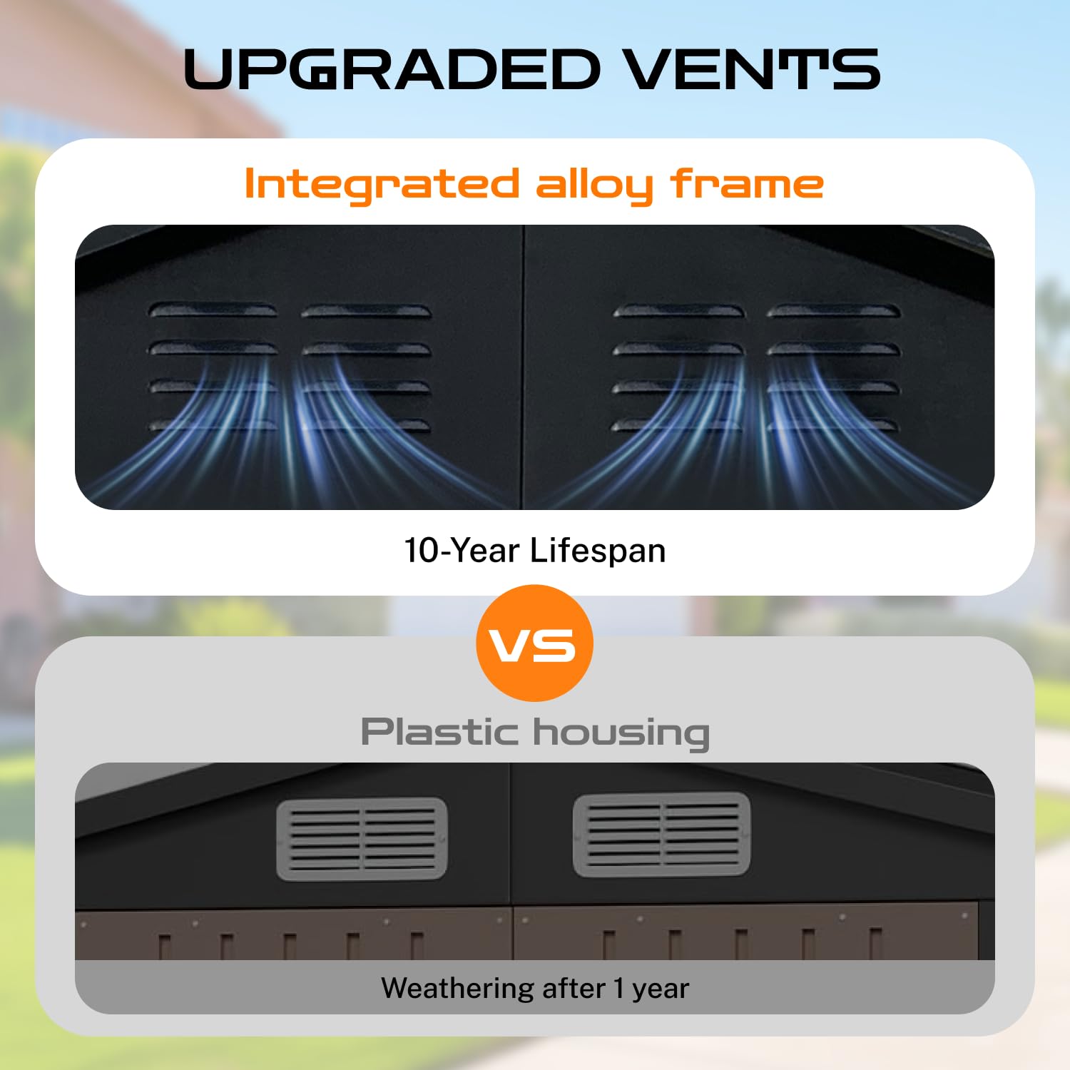 Details: Maximize your outdoor organization with this practical garden storage shed. Its space-efficient pent roof design creates impressive storage room for tools, equipment, and materials. Unlike typical plastic vents, integrated perforated vents provide better ventilation and are more durable.Assembly is quick and easy thanks to the uniquely designed, sturdy aluminum frames – no prior experience needed for a solid setup