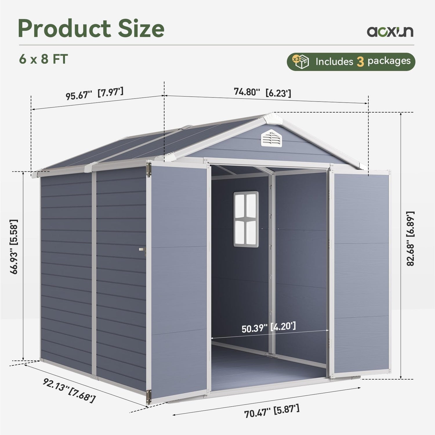 Aoxun 8 x 6 FT Outdoor Storage Shed with Window, Resin Shed with Floor & Lockable Doors, Garden Shed Waterproof Plastic Tool Shed with Sloped Roof for Backyard, Garden, Patio, Lawn, Grey