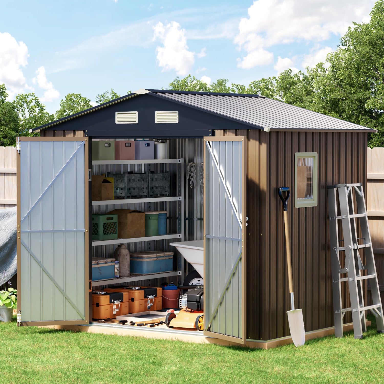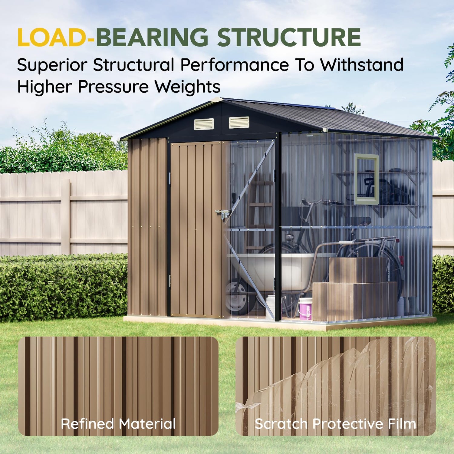 Breezz 8x6FT Outdoor Steel Storage Shed with Clear Window, Lockable Doors, Weather-Resistant Metal Tool Shed for Garden, Backyard, Patio, and Utility Storage.Brown