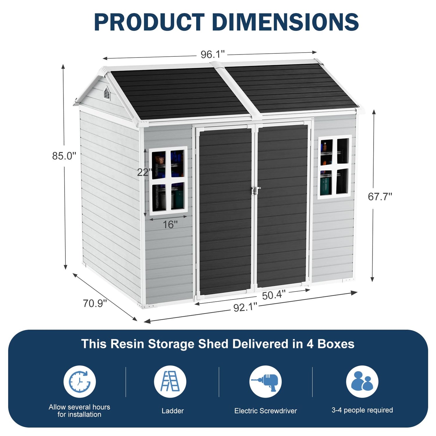 CDCASA 8x6 FT Resin Storage Shed, Waterproof Large Outdoor Shed with Floor & Lockable Door & 2 Windows, Vent, Plastic Tool Shed for Outside, Backyard, Patio, Poolside, Bike, Dove Grey