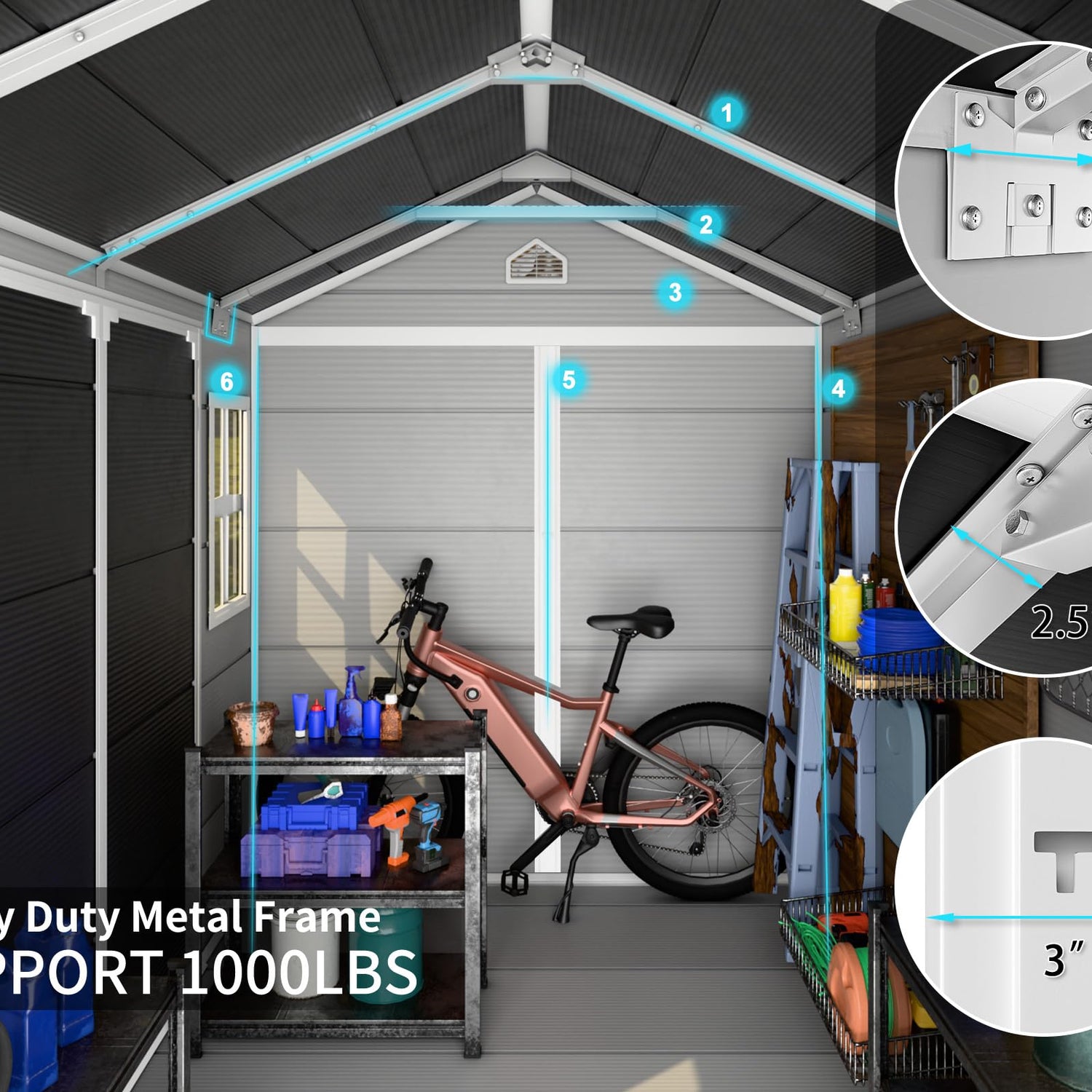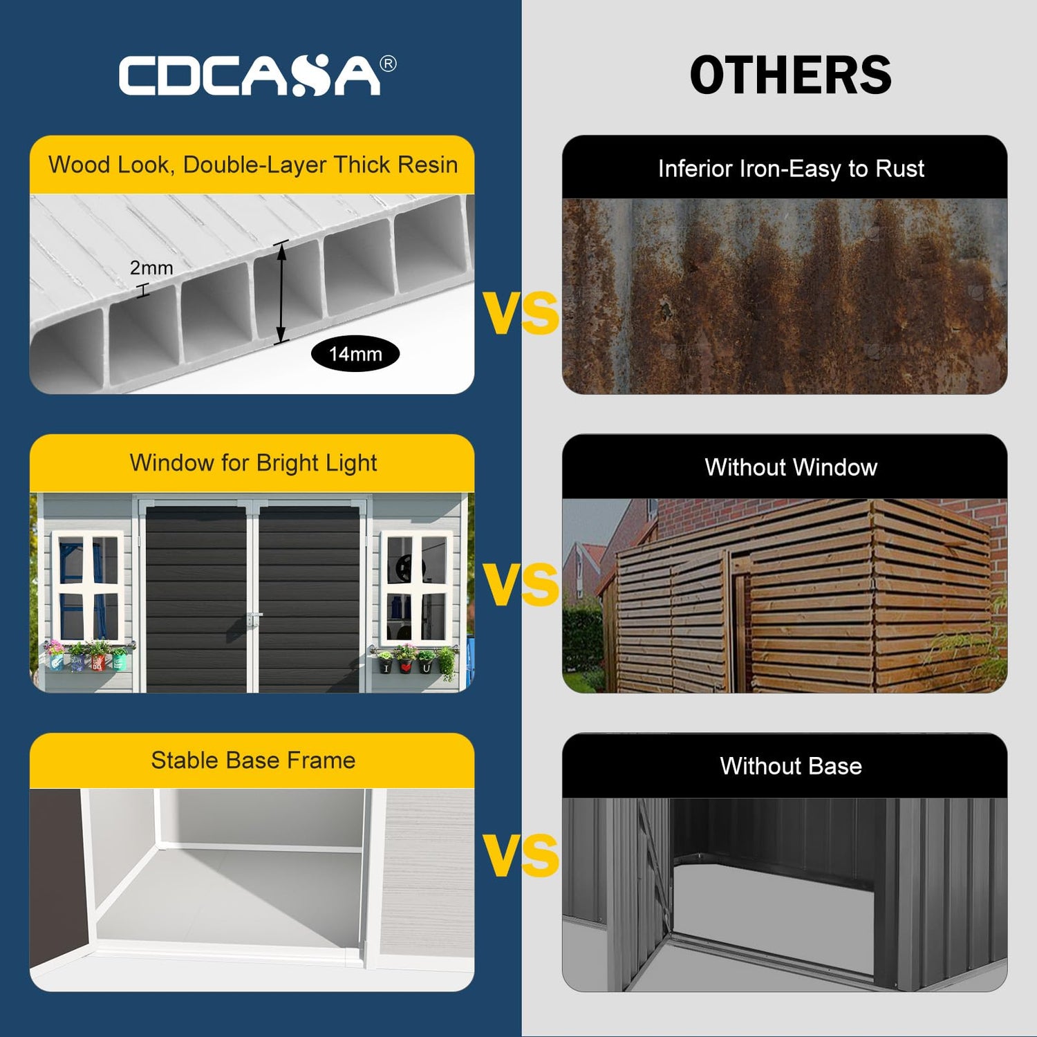 - 【Premium and Durable Material】The 14mm tough double-wall resin construction, 0.6 mm galvanized steel frame and impact-resistant floor are designed for long-term durability. The double-wall panels are waterproof and moisture-proof, allowing worry-free use in all weather conditions. It is weather-resistant, waterproof, and UV-resistant-no peeling, rotting, or rusting. The screws are embedded to ensure aesthetics and safety