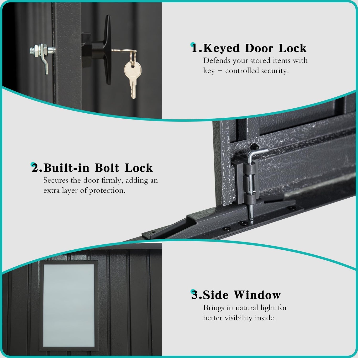 - Lockable Security & Stability - The lockable design with sturdy latches protects your valuables from unauthorized access. For added stability, the shed can be anchored to a concrete foundation or secured into soft ground using auger anchors, offering reliable protection even in strong winds.