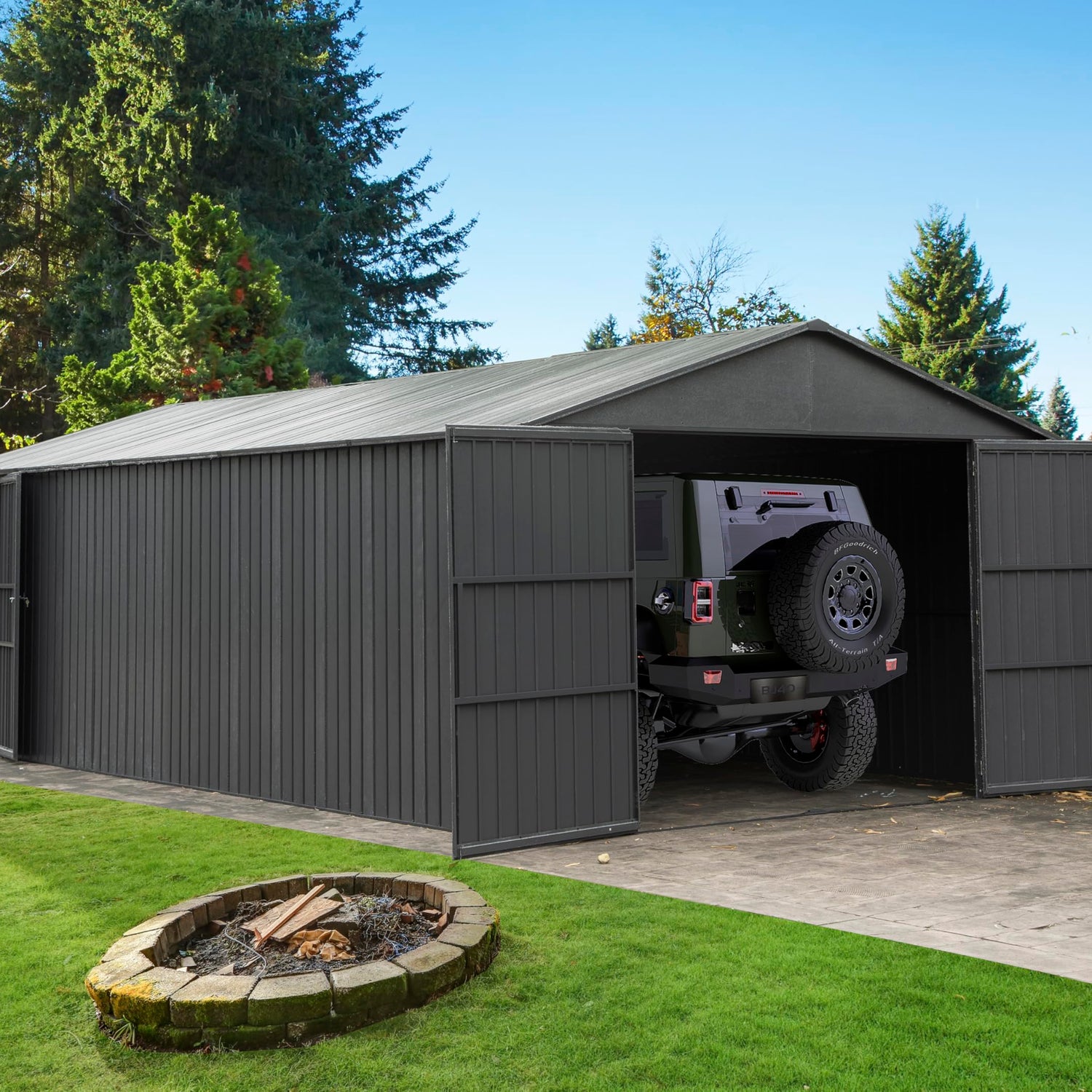 Domi 12x25FT Outdoor Metal Garage Shed, Extra Large Carport with Skylights & Dual-Entry, Backyard Storage Shed for Car, Truck, Lawn Mower and Tool, Dark Grey