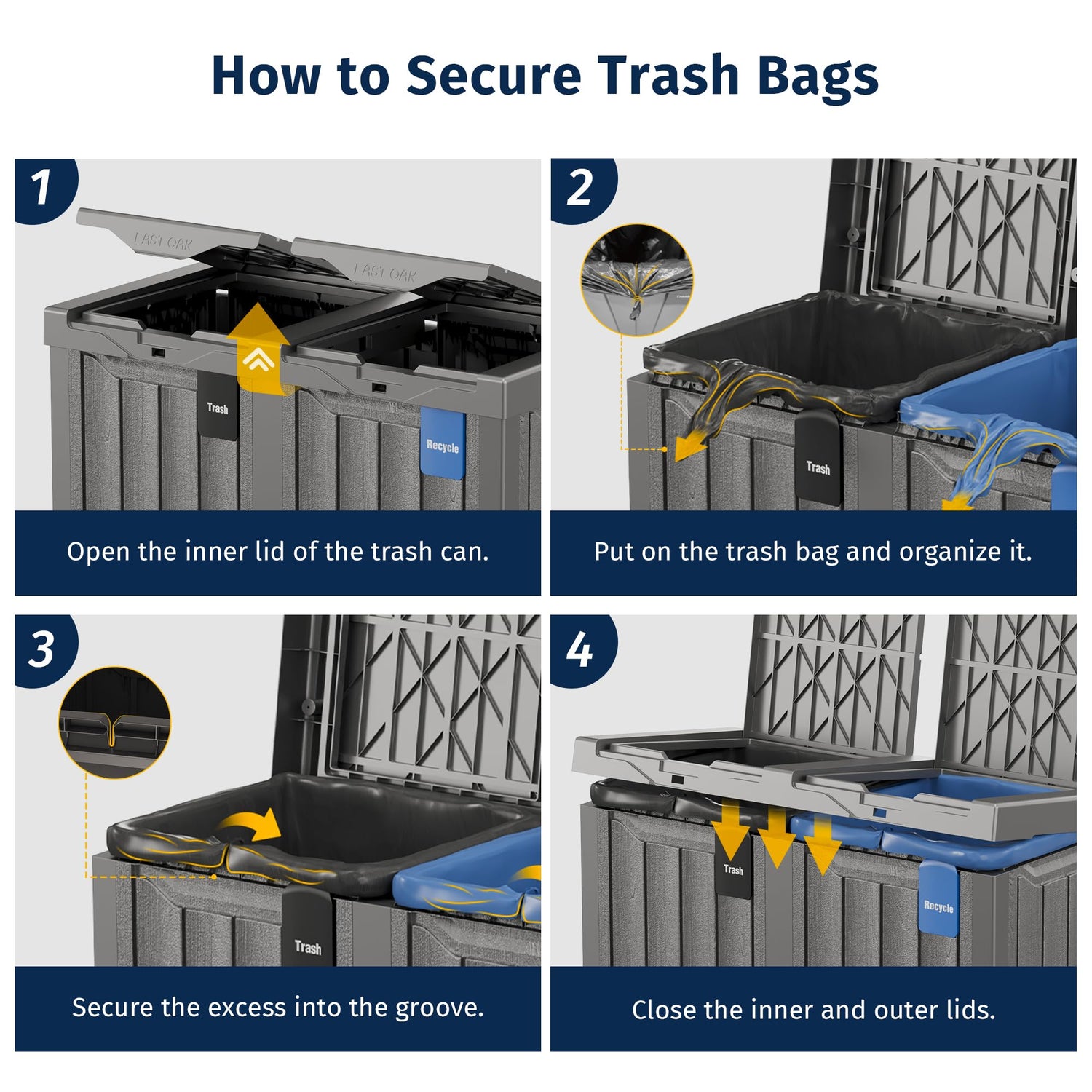 EAST OAK 62 Gallon Outdoor Trash Can | Waterproof Resin Garbage Can with Recycle and Garbage Labels | Secure Bag Lip Lock and Drip Tray | Outside Trash Bin for Patio | Kitchen, Backyard or Deck | Gray