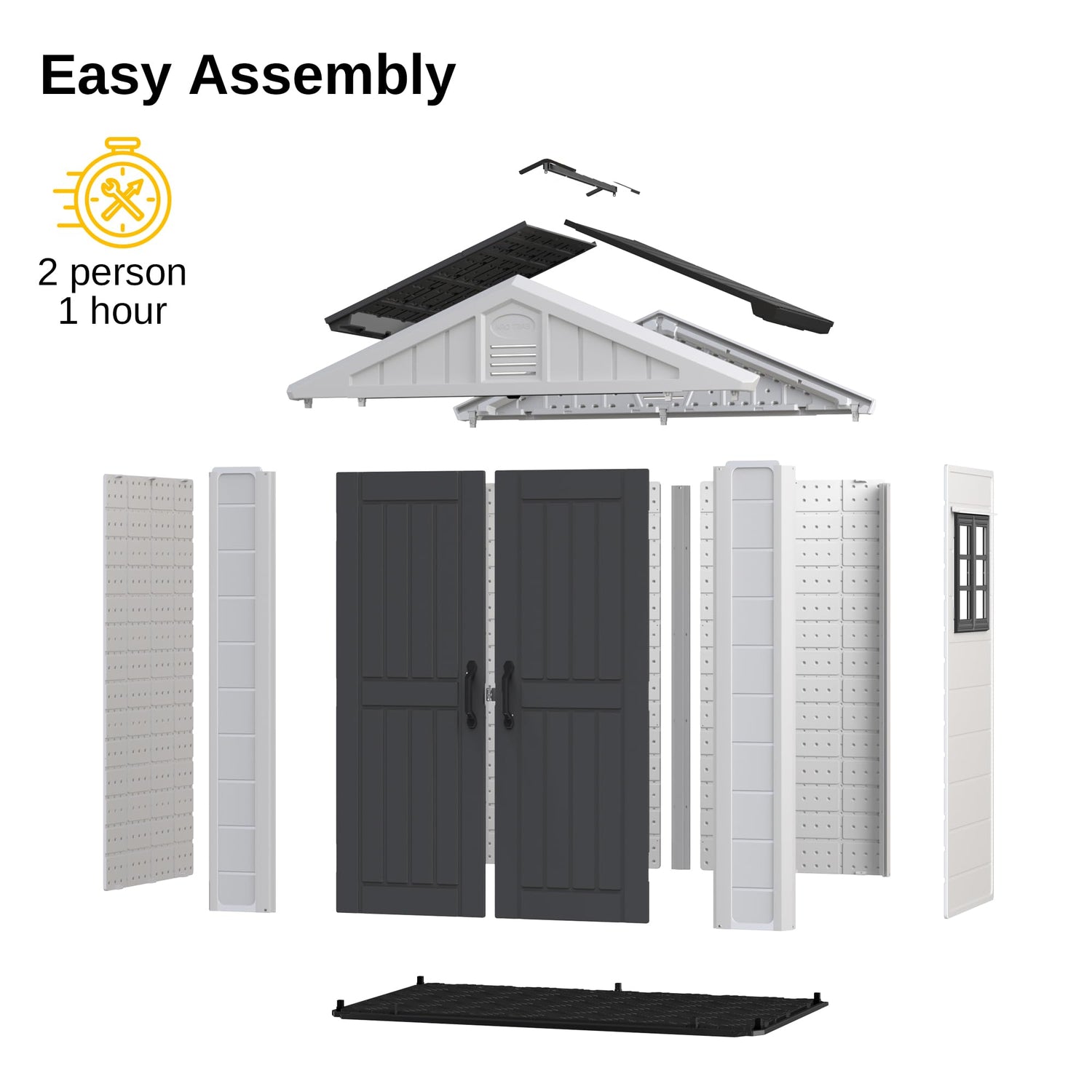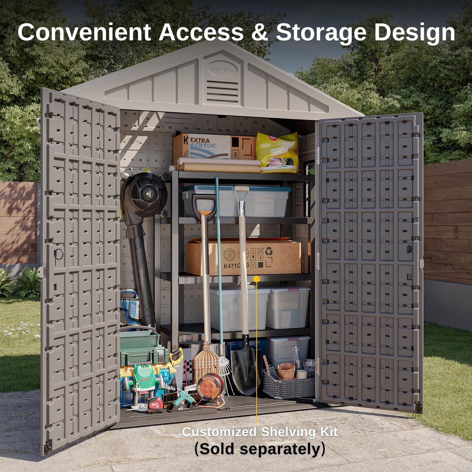 - WEATHER-RESISTANT MATERIAL: The East Oak Storage Shed is made of high quality HDPE material, with UV protection for more than 8000 hours and waterproofing. It can be used daily for five years without fading.