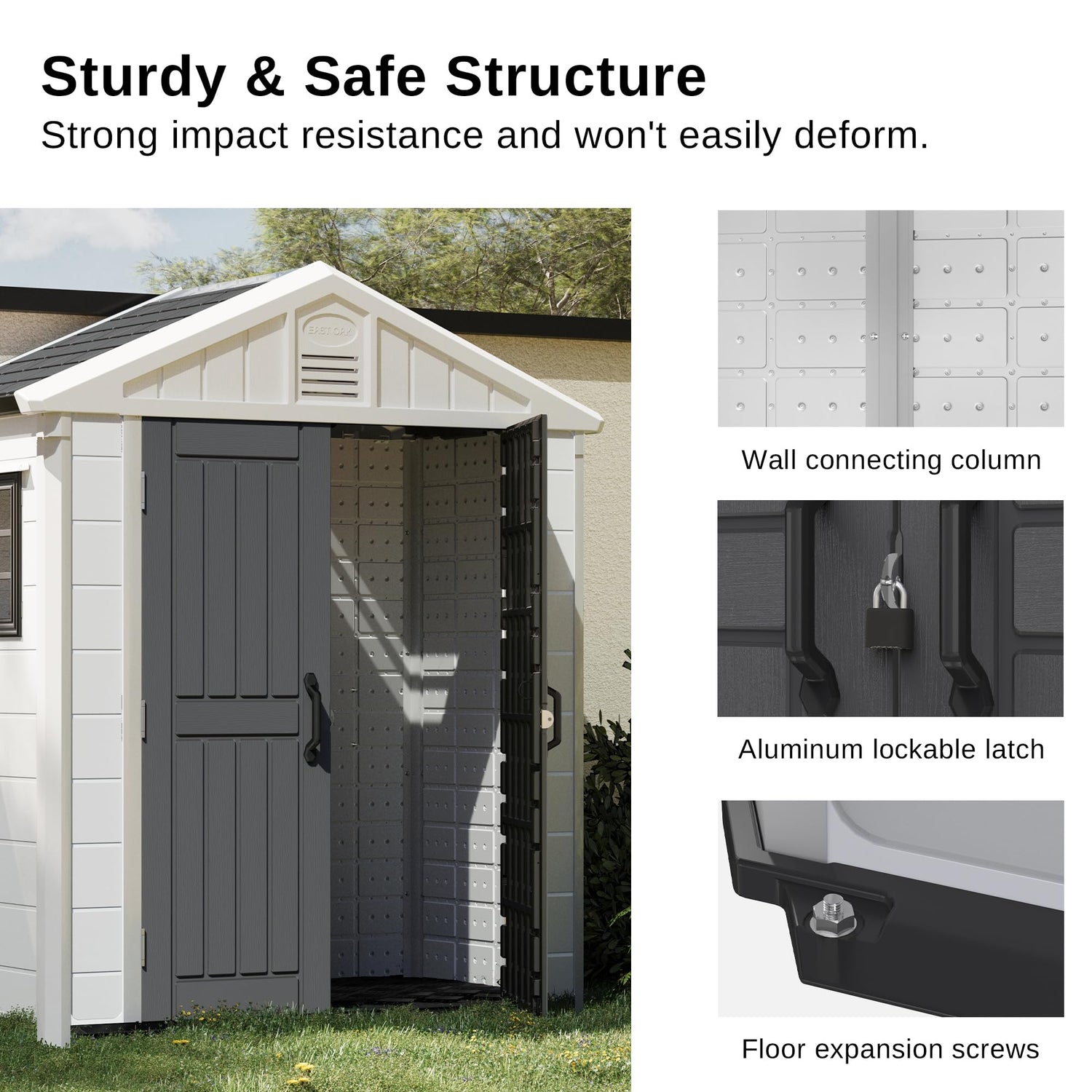 - SAFER OUTDOOR STORAGE: The East Oak Outdoor Shed comes with durable aluminum alloy latch that is not easily rusted and deformed; and is also equipped with a lock to make outdoor storage more secure.