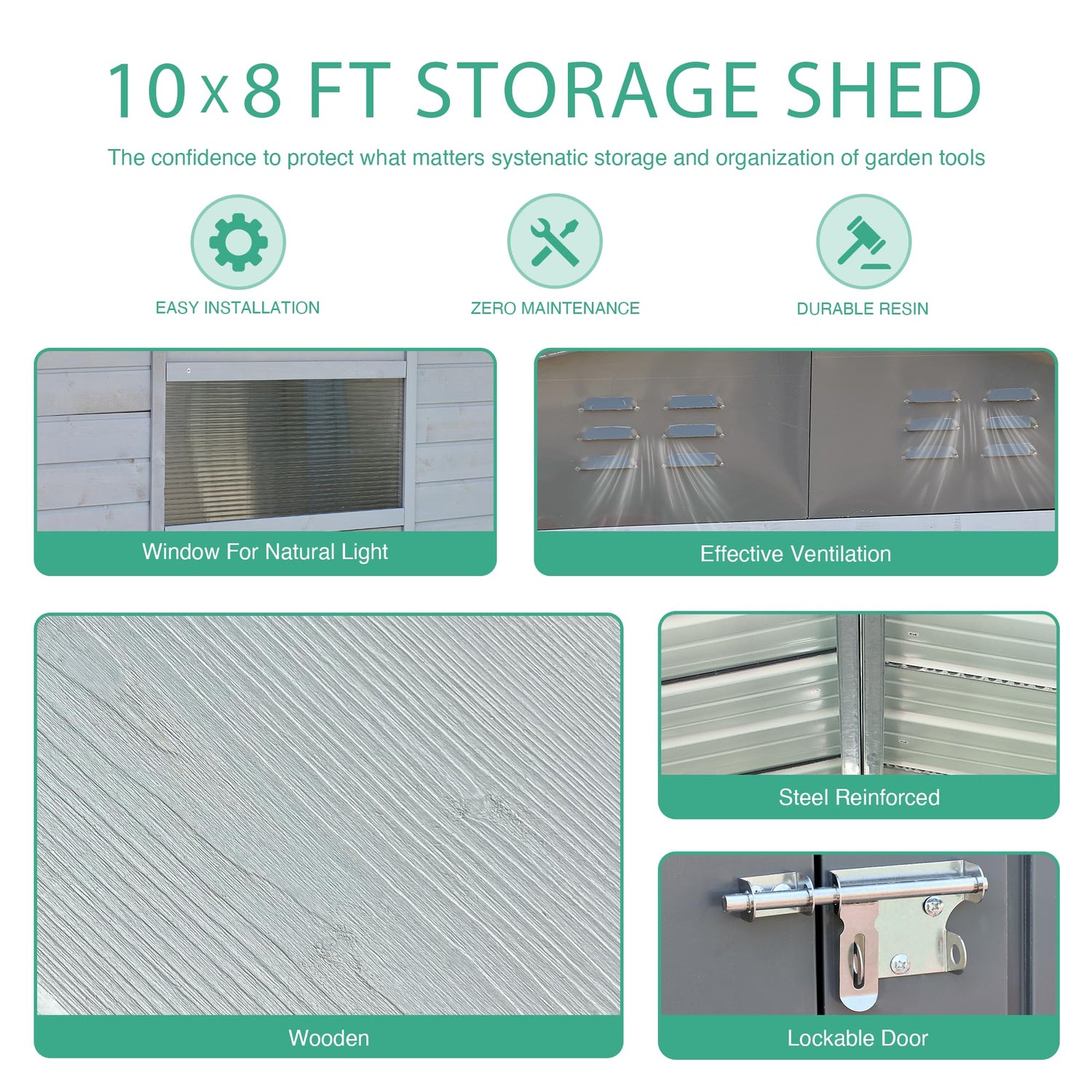 FammyLoft 8x10 FT Outdoor Storage Shed with Windows, Wood & Metal Garden Shed, Outside Storage Shed Waterproof for Backyard, Garden, Patio, 4 Vents (Without Floor) Gray