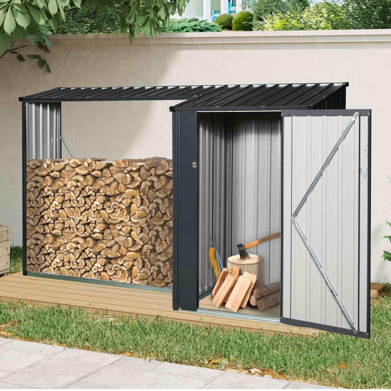 - TWO-IN-ONE DESIGN: This versatile outdoor storage solution combines a spacious firewood rack with a secure metal shed for garden tools, maximizing your backyard organization while maintaining a compact footprint of 8.55' x 5.30' x 5.30'