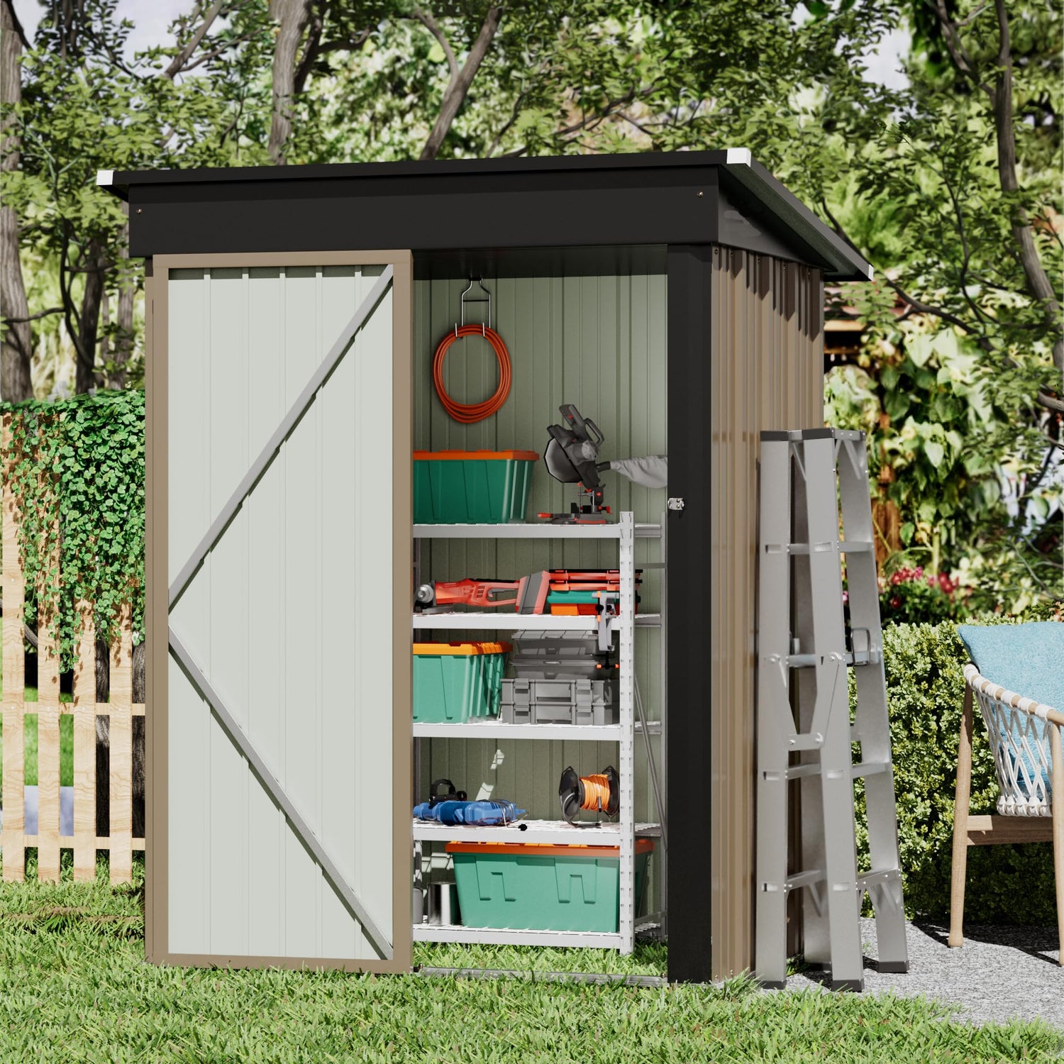 GUNJI 5 x 3 FT Shed Outdoor Storage Shed Metal Garden Shed with Lockable Door Outside Waterproof Tool Shed for Backyard, Patio, Lawn (Brown)