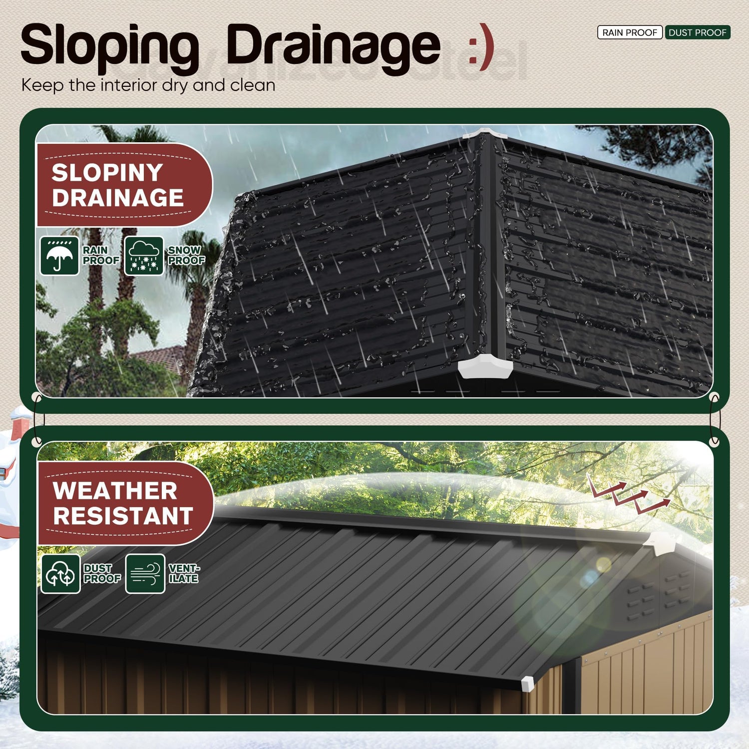 • Outdoor Shed: The material of the metal shed has strong rust and UV protection, whether it's heavy rain, hot sun, or snow, you don't have to worry about your outdoor shed. And the storage shed is designed with a lockable door, which improves the safety of outdoor use and prevents some small animals from accidentally entering.