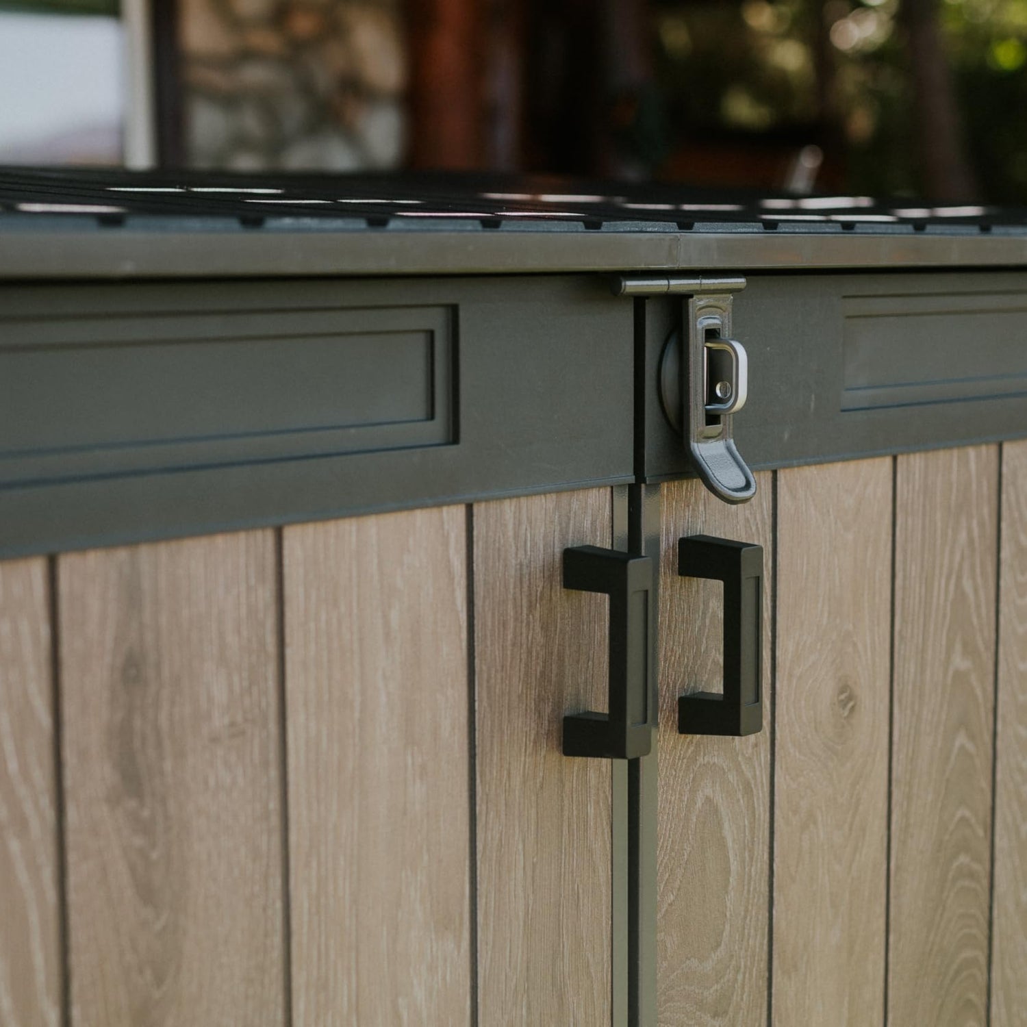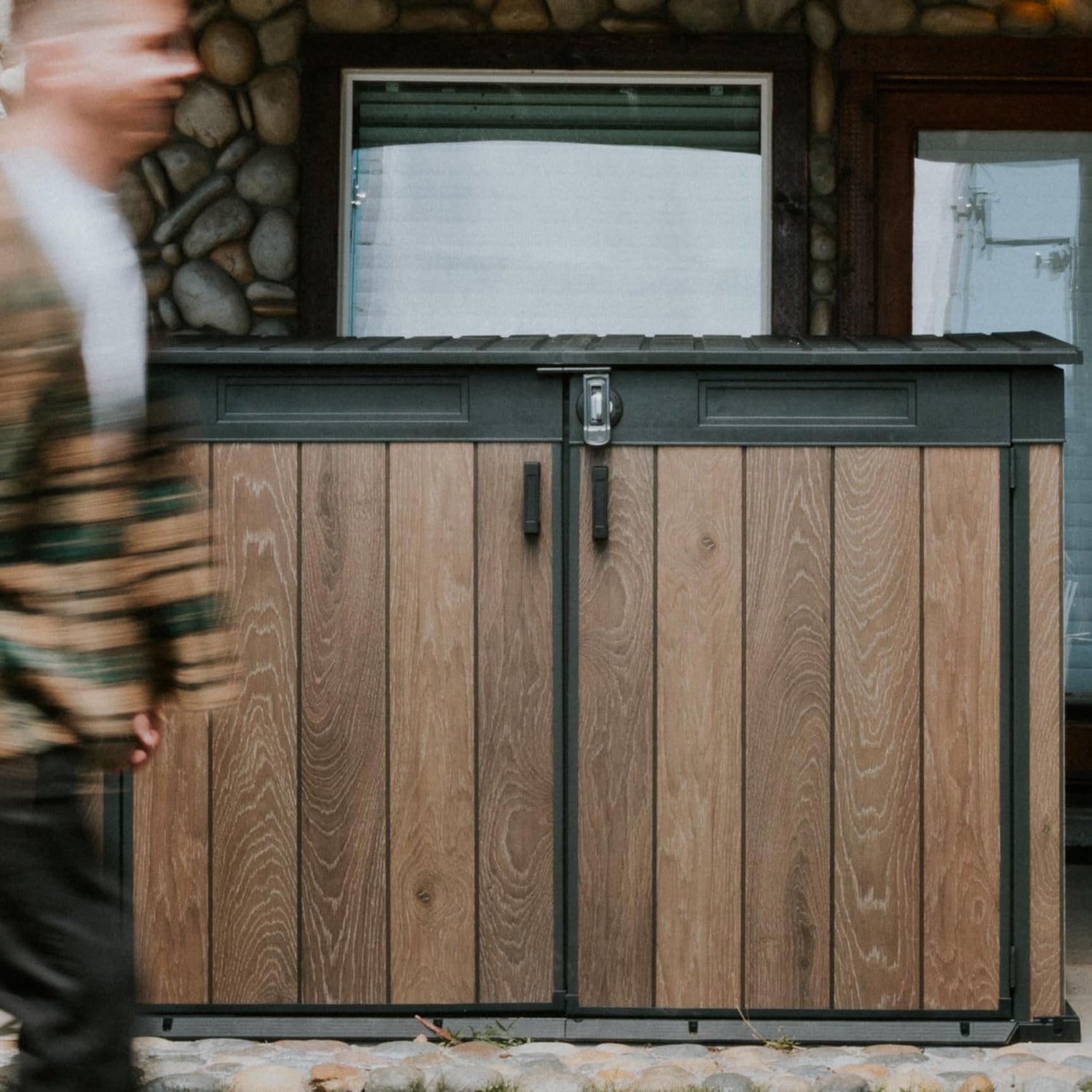Details: The horizontal shed from Keter’s Signature Collection doesn’t just keep large outdoor items like your bicycles or garbage cans safely stored behind lockable doors; it also adds some natural beauty to any accommodating outdoor space. With features like adjustable brackets to support a wooden shelf, this weather-resistant small resin shed also has 533G of space which allows you to easily store two 95G or three 63G garbage cans. Since this shed is often used to store bulkier, smellier items (like trash cans), it has built-in ventilation, a bin opening kit, hydraulic pistons and an included shed floor that is sloped for easy maneuverability. The double doors allow you to move items in and out smoothly. The horizontal storage shed has a modern pent roof while also being extremely durable. It is steel-reinforced and has a double-walled construction. The best part? It comes in an easy-to-assemble kit.