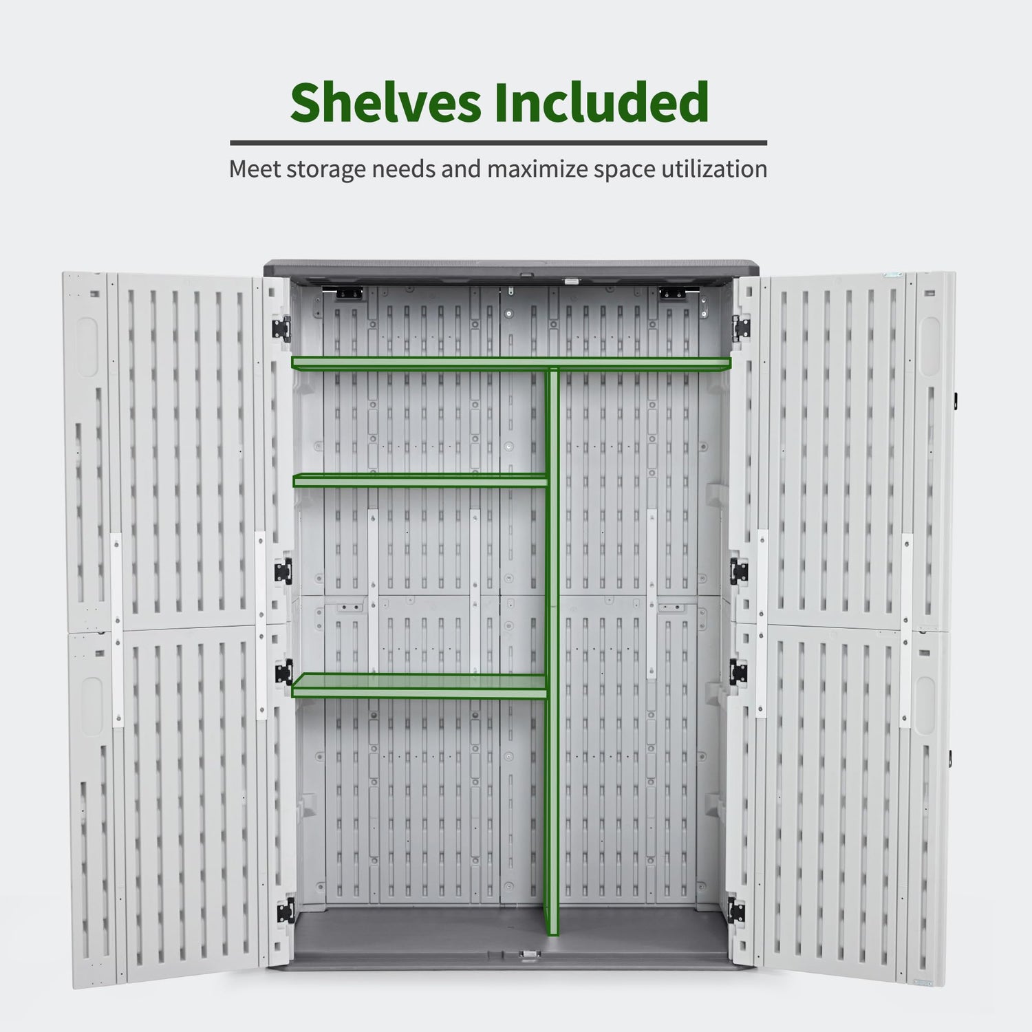 - Metal Shelves: The matching metal shelves of the resin shed maximize the use of space and get different partitions for various storage needs