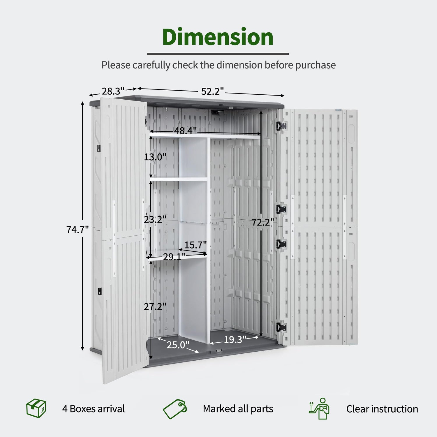 - Tall Plastic Shed: Overall Dimension: 52.16 (W) x 28.34 (D) x 74.68 (H) inch; Internal Dimension: 48.43 (W) x 25.00 (D) x 72.20 (H) inch