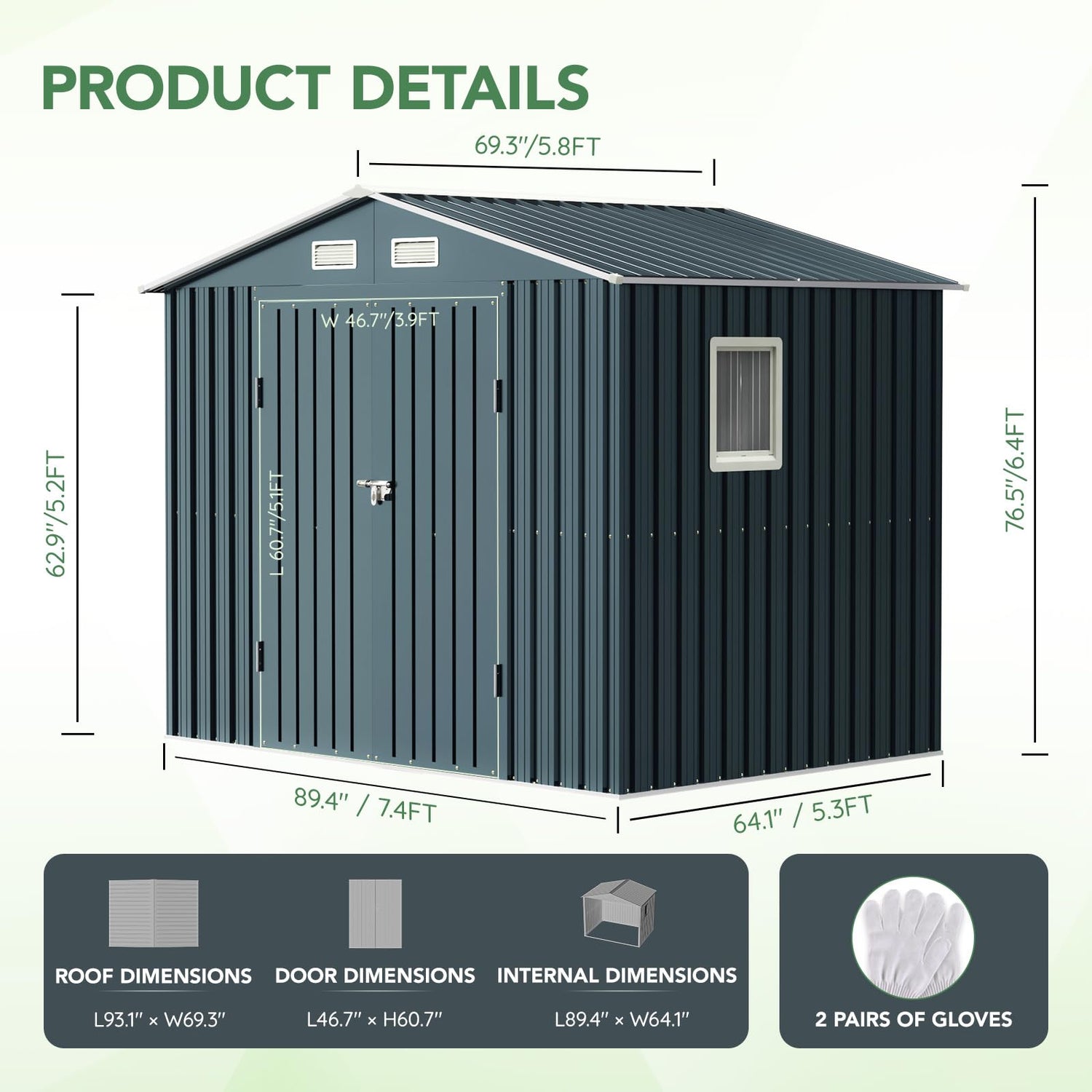 - Large Size with Maximum Storage: The actual dimensions of our 6x8ft tool shed are 5.3 x 7.4 ft (64.1 x 89.4inches), providing ample space for your garden tools and outdoor equipment. While named for convenience, the precise measurements are detailed in the product image for your reference.