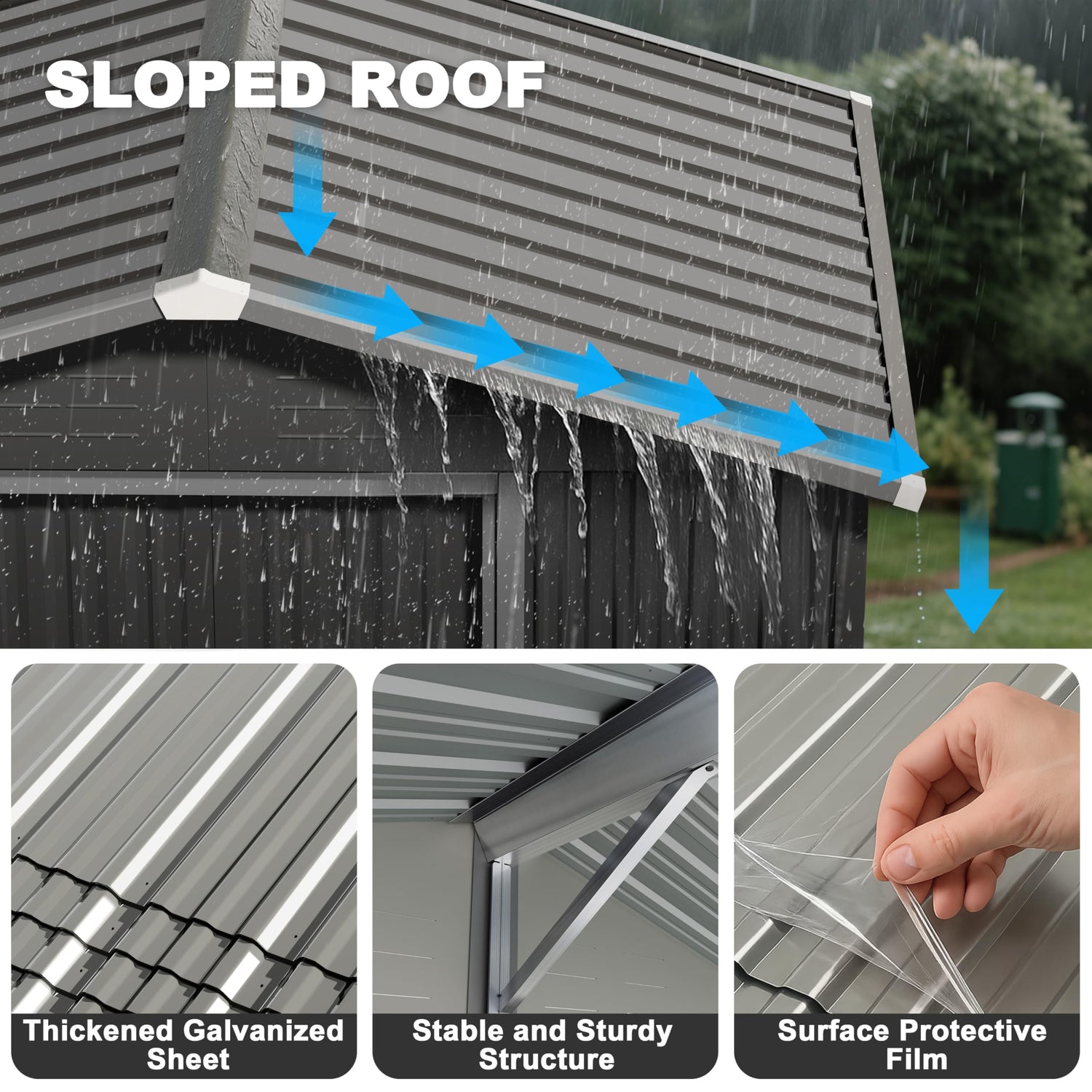 - REINFORCED STRUCTURE WITH SLOPED ROOF:The steel frame resists warping, while the 16° roof prevents water buildup. A 28.3" wide door fits most tools and mowers—great for any garden storage shed setup