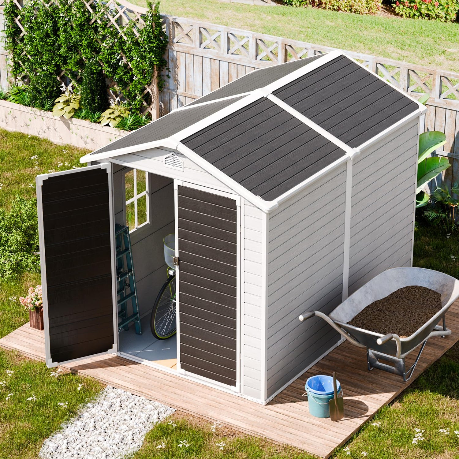 • 【PREMIUM RESIN MATERIALS SHEDS】 Our durable storage shed is crafted with 15MM premium polypropylene resin plastic, which is thicker than others in the market. Resin shed is waterproof, rustproof and UV-resistant, less bending and puncturing, worry-free for use in all weather conditions. It is a great shed house for your backyard, patio and garden