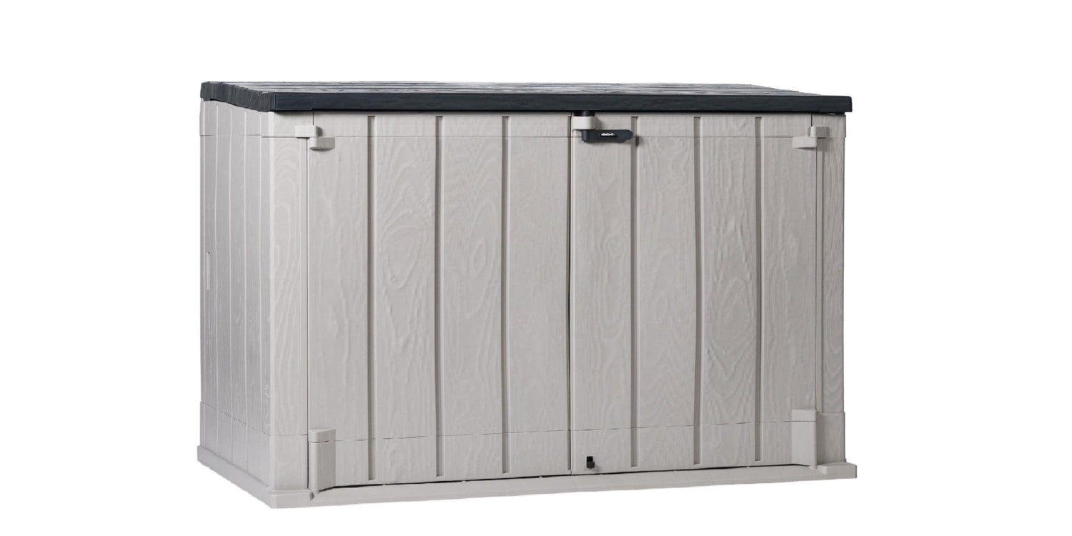 Details: The Stora Way Plus XL Tool Box is the perfect solution for storing large garden tools and equipment. Its maximum capacity of 1270L allows you to comfortably store deckchairs, lawnmowers and many other objects distributed in 145 cm long, 85 cm wide and 124.5 cm high. The attractive wood-effect panels in contrasting grey and black ensure this shed a home in any garden. Opening is made easy thanks to the presence of pistons and the padlock hole offers the possibility to close everything safely (padlock not supplied). Its structure is robust and the floor is integrated. It is made from recycled and recyclable plastic (polypropylene), water and UV resistant. Finally, assembly is made easy thanks to a few interlocking parts and clear and exhaustive illustrations.