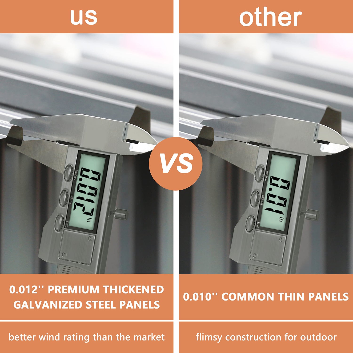 - Thicker, Stronger And More Sturdy Shed - We upgraded the thickness of galvanized steel in our storage shed to 0.012 ". Thicker than most products on the market. This metal storage shed is designed to withstand a wide range of weather conditions, making it suitable for outdoor use. And with a huge amount of space, it's a great choice for storing gardening tools and other outdoor equipment.