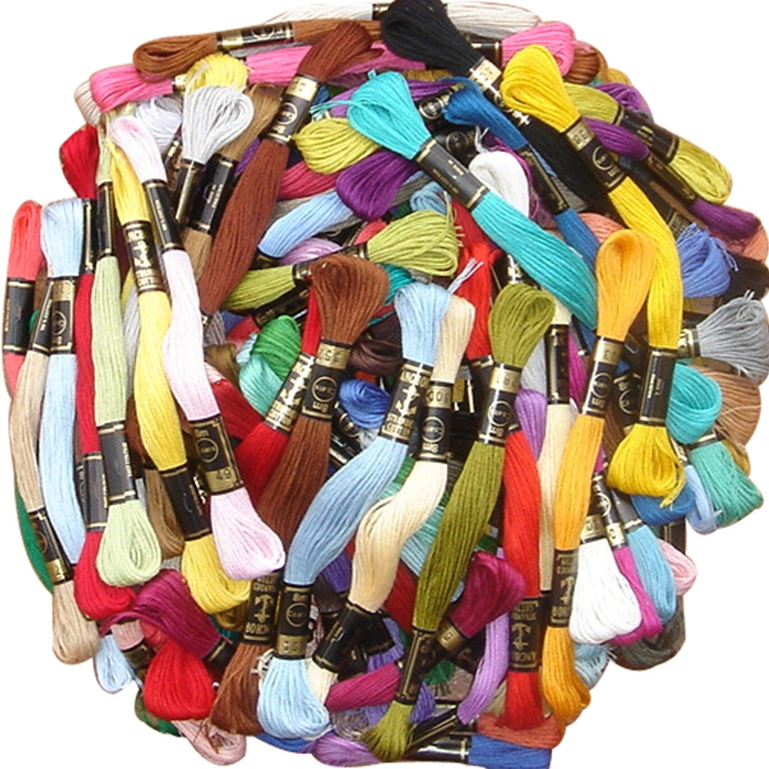 Details: 50 Colors of High Quality Floss Anchor Brand. I Guarantee these are best quality Floss you will find. This set has the widest range of colors: There are lots of blues, greens, reds, Orange, Pink, Yellow, Greys, Purple etc. Very large range of colors You will not find these beautiful floss anywhere else. Each Floss is 8 mts (8.4 Yards) Long, they are 50 colors as shown in the pictures