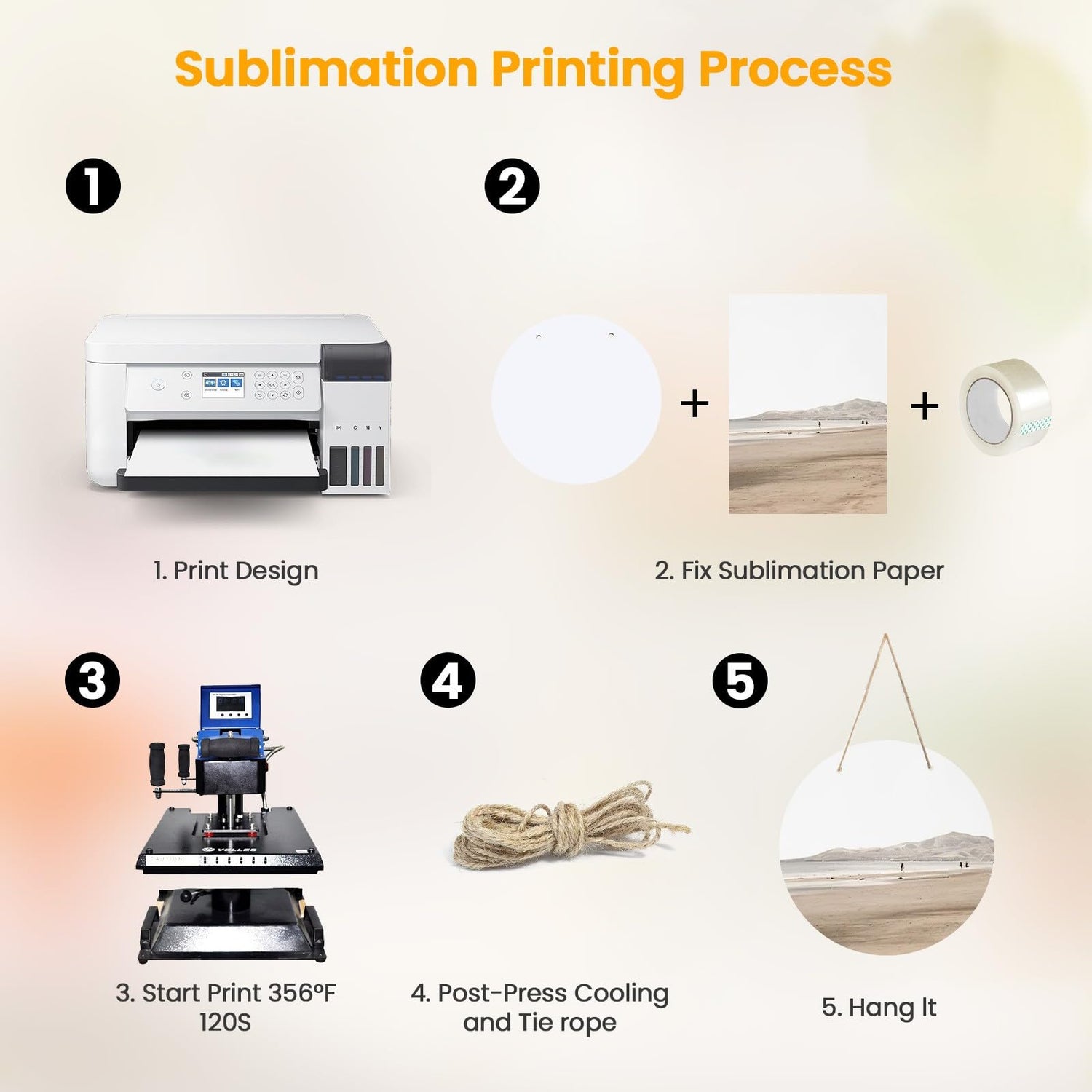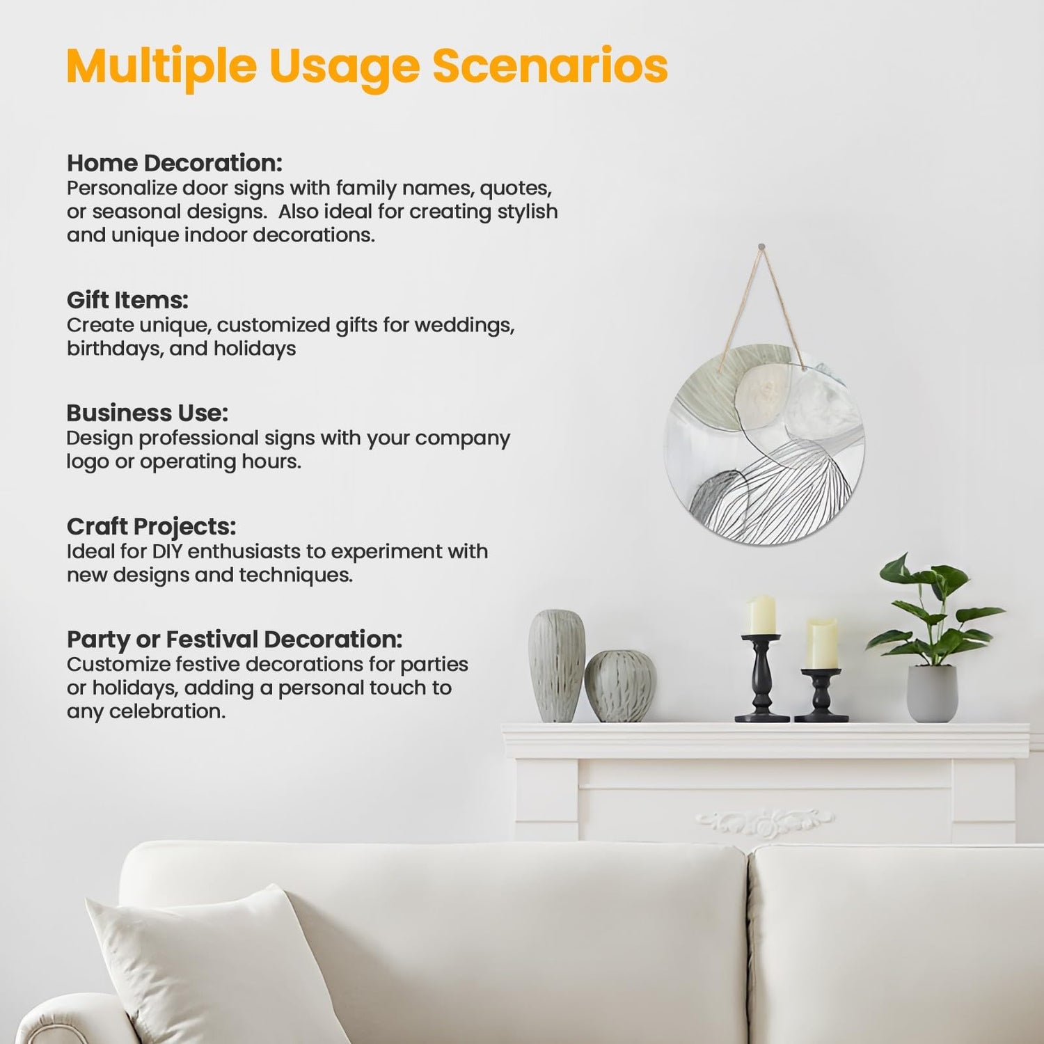 MDF Material Circle White Blanks: Made from premium white hardboard MDF, these 10" round blanks are sturdy and offer a smooth surface perfect for detailed sublimation printing. The 0.2-inch thickness ensures durability, making them ideal for various crafting projects. Specialized Sublimation Coating: Each blank is coated with a specialized sublimation layer that enhances color vibrancy and detail. This coating ensures that your designs are transferred with exceptional clarity and helps resist fading over time, making them perfect for long-lasting decorative pieces. Sign Blanks with Rope for Multi-Purpose Use: These MDF blanks come with double rope holes and a hemp rope for easy hanging. They are ideal for creating personalized door signs, unique wall art, and business promotional items, making them a favorite among DIY enthusiasts and professional crafters. MDF Wood Sublimation Blanks Wall Hanging for Heat Press Machine Printing: Designed for use with sublimation printers and heat presses, these blanks allow for a simple and efficient printing process. Print your design, attach it with sublimation paper, and press at 356°F for 120 seconds for vibrant, high-quality prints. Versatile Size and Shape: With a 10-inch diameter, these round MDF blanks offer ample space for creative designs. The classic round shape complements a wide range of decor styles, making them perfect for custom gifts, home decorations, or promotional items.