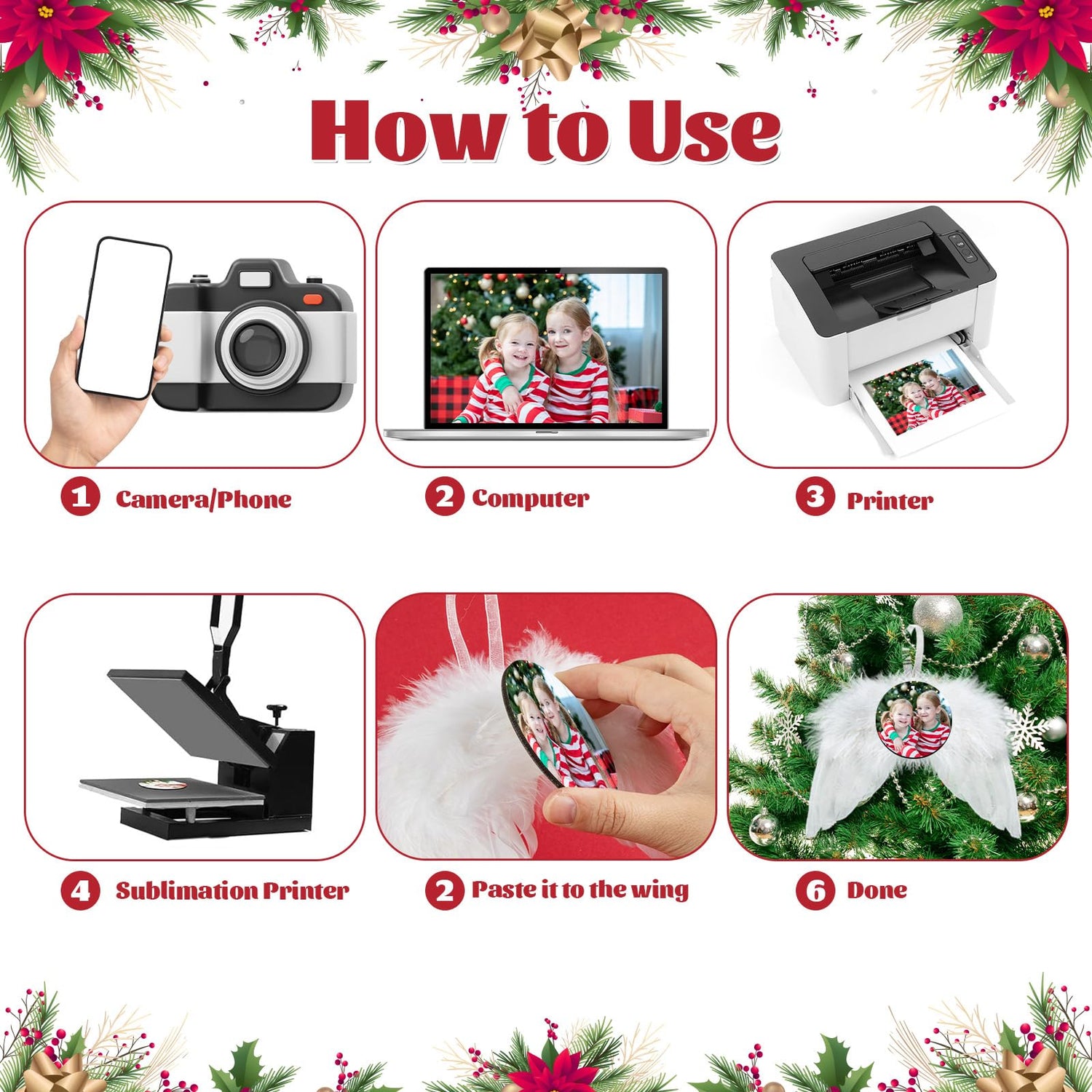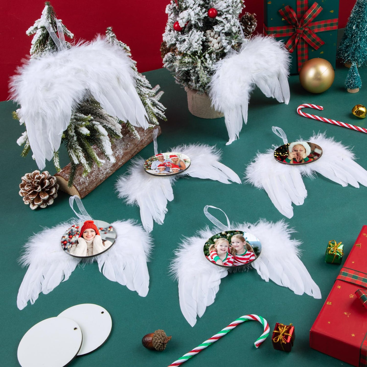 - 【Easy to Use】The angel white wings and the sublimation ornaments are separate, you can first print the favorite photo on one side of the wood ornaments (make sure to take the clear plastic off first), and then use sufficient amount of glue or a hot glue gun instead (not included) to paste them to the wings, and finally you can hang the white angel feather wings ornaments on the Christmas tree.