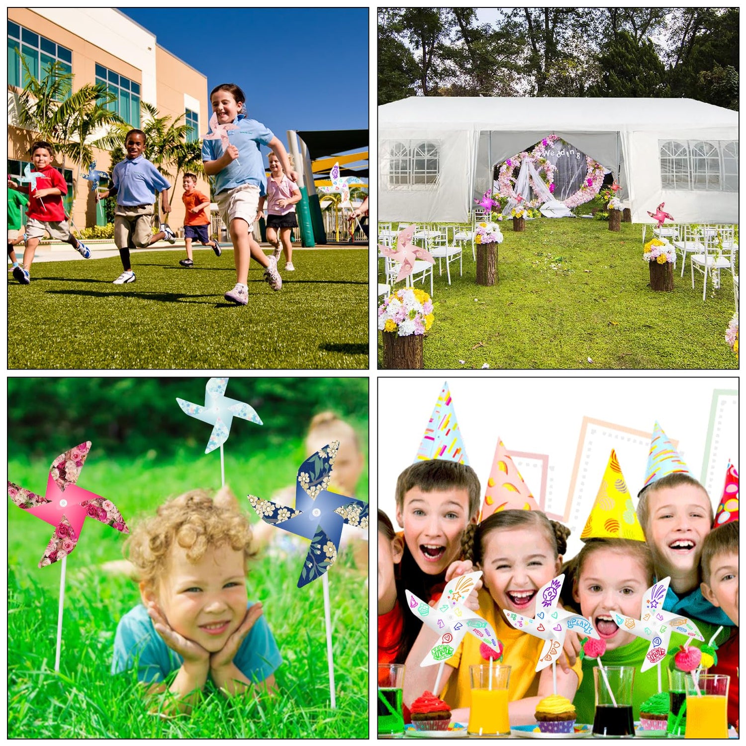 • 【Easy to make】 Just print or draw your favorite pattern on the windmill, fix the pre-cut fan blades to the center point, then insert the plastic stake into the hole. A charming windmill toy is completed.