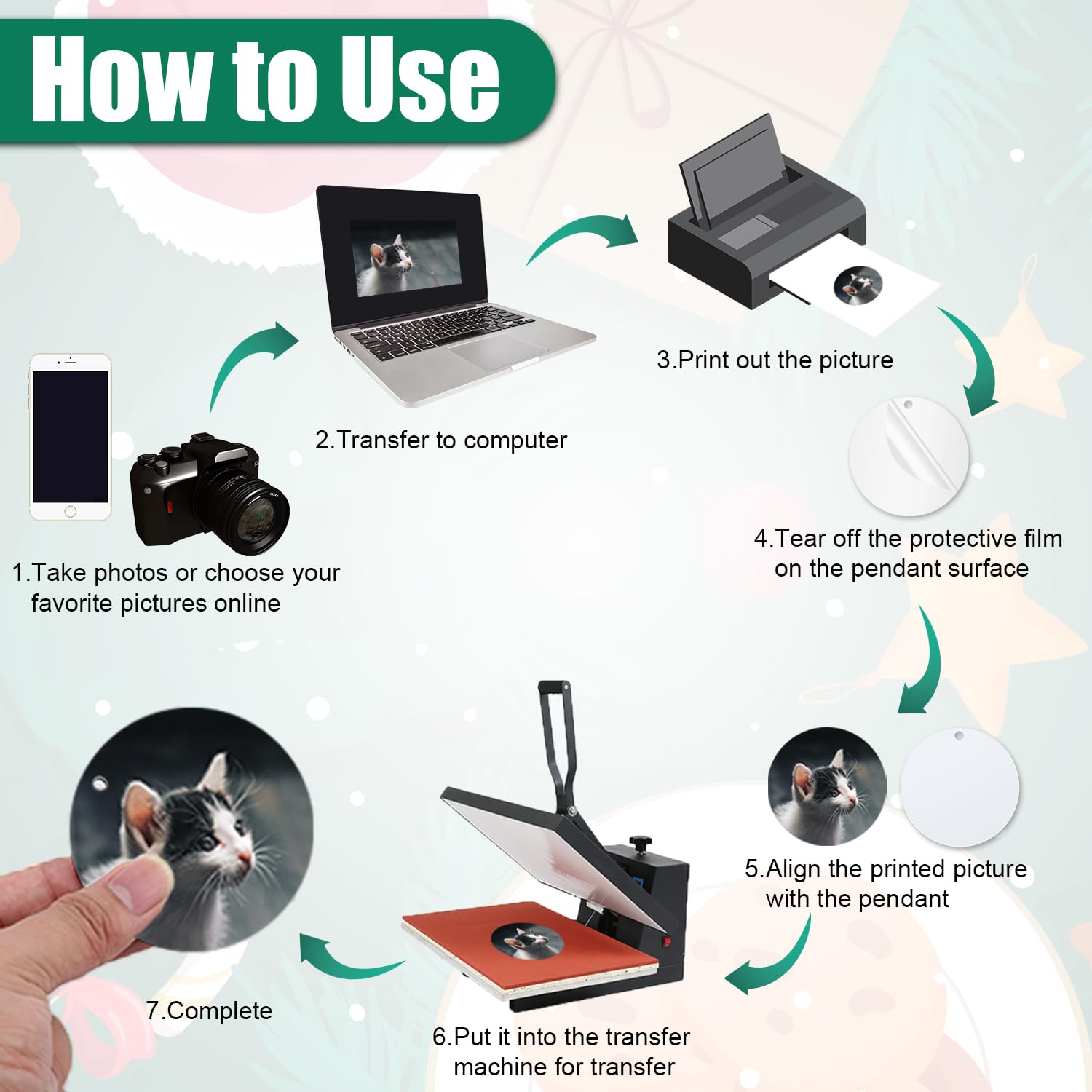 - Instructions: Temperature: 356°F-374°F (180°C-190°C), time: 70 seconds, suitable for heat press transfer. Note: There are protective films on both sides of the pendant, please tear them off when using.