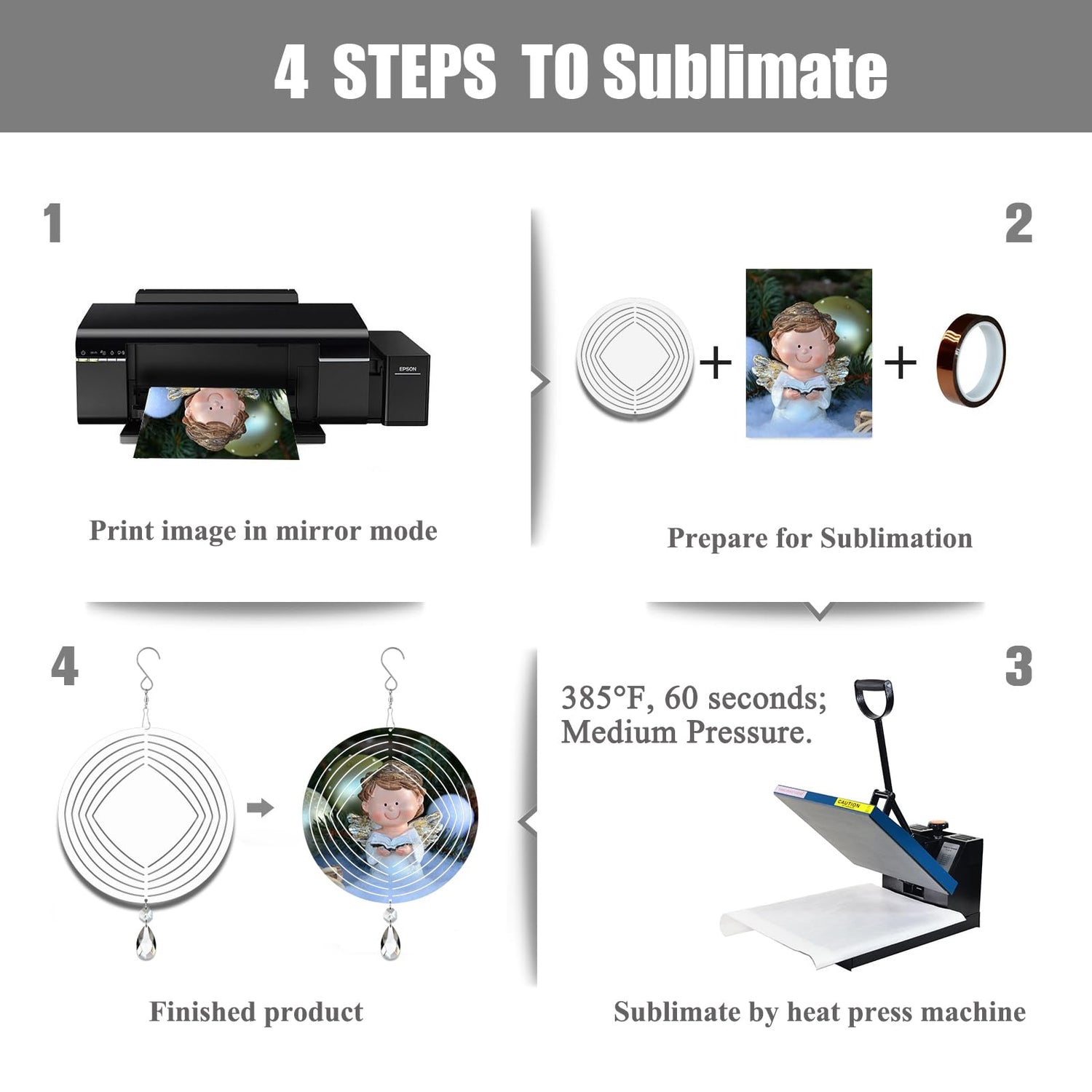 - 【Perfect Sublimation Coating】Our 3D Double Sided Wind Spinners come with premium sublimation coating that promise the sublimation print colors bright and won’t fade. It can be personalized both sides with single or 2 different designs. Heat press setting 385°F for 60 seconds; Medium pressure.